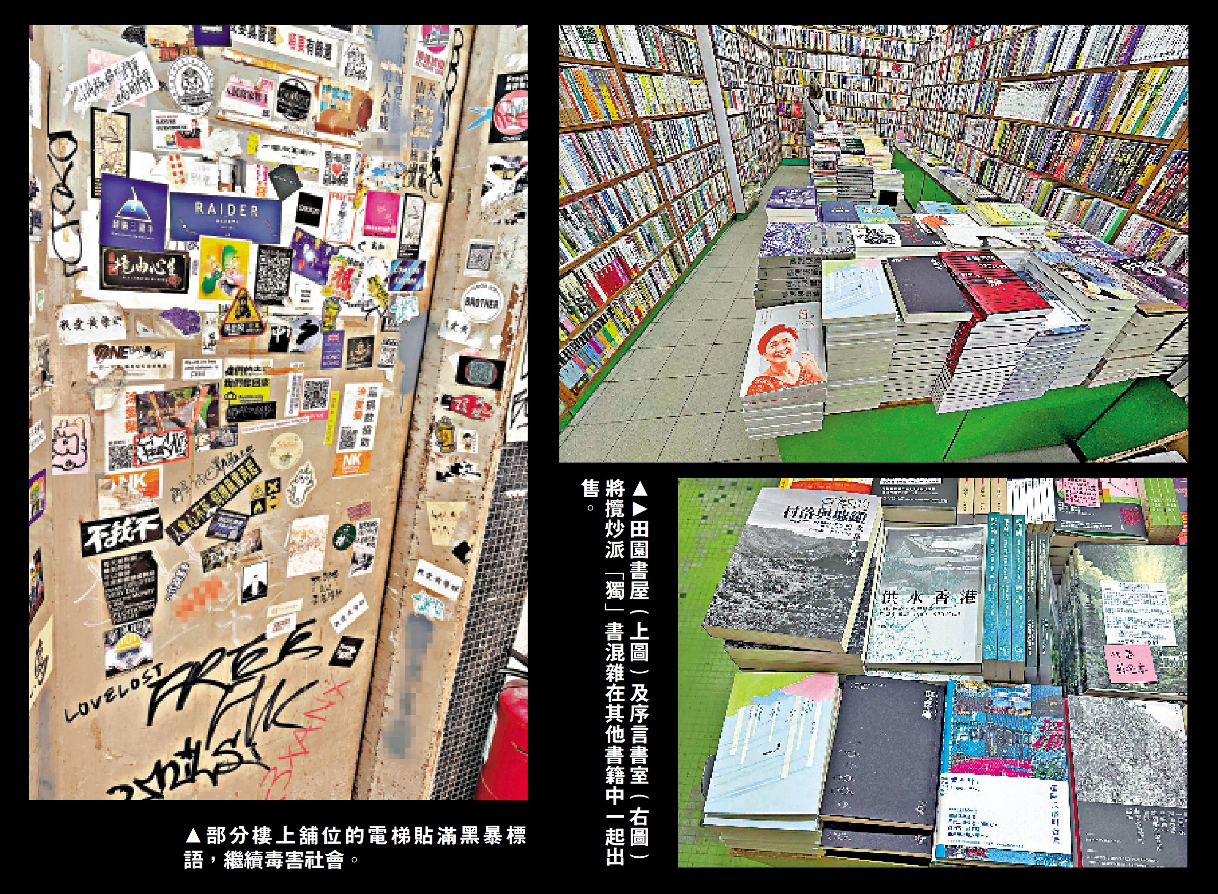大公報記者近日走訪旺角多地,發現不少獨立書店內擺放不同種類描述所謂「民主倒退」、甚至是美化2019年黑暴的書籍。三無大廈及樓上舖是這些「毒書店」的滋生地點,有的牆上貼滿諸如「人傘心不死 伺機風雲起」、「fight for freedom」等煽暴標語。
