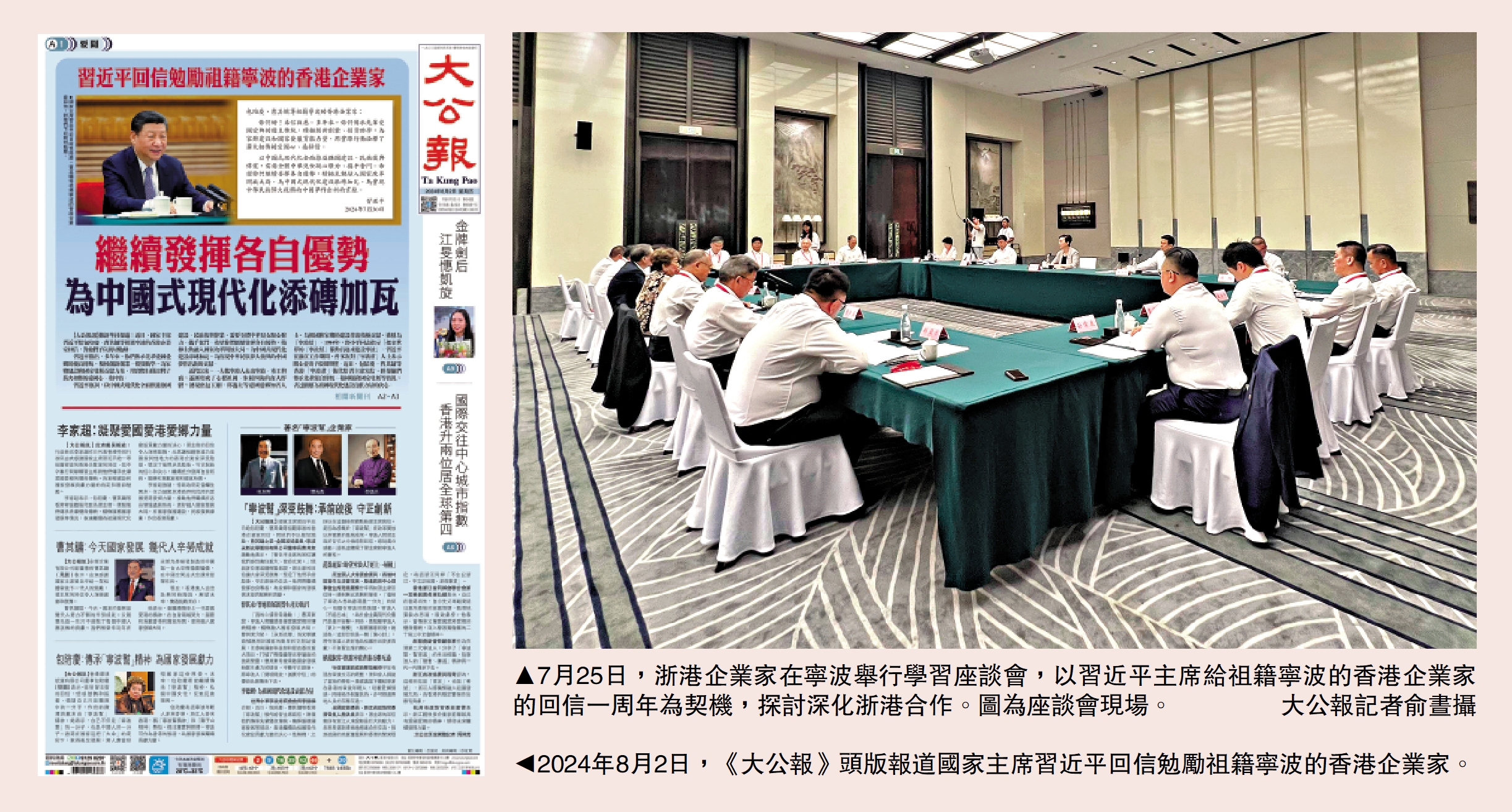 「多年來,你們傳承先輩愛國愛鄉的優良傳統,積極創新創業、捐資助學,為家鄉建設和國家發展貢獻力量,用實際行動詮釋了薪火相傳的愛國心、桑梓情。」回憶起一年前習近平主席給祖籍寧波的香港企業家的回信,「寧波幫」代表曹光彪先生之子、寧波永新光學股份有限公司董事長曹其東在25日舉行的浙港企業家學習座談會上感慨道,習主席的回信是新時代的家書,更是強國建設的動員令,是對全體中華兒女的深情召喚。\大公報記者 俞晝、王莉、連慜鈺寧波報道