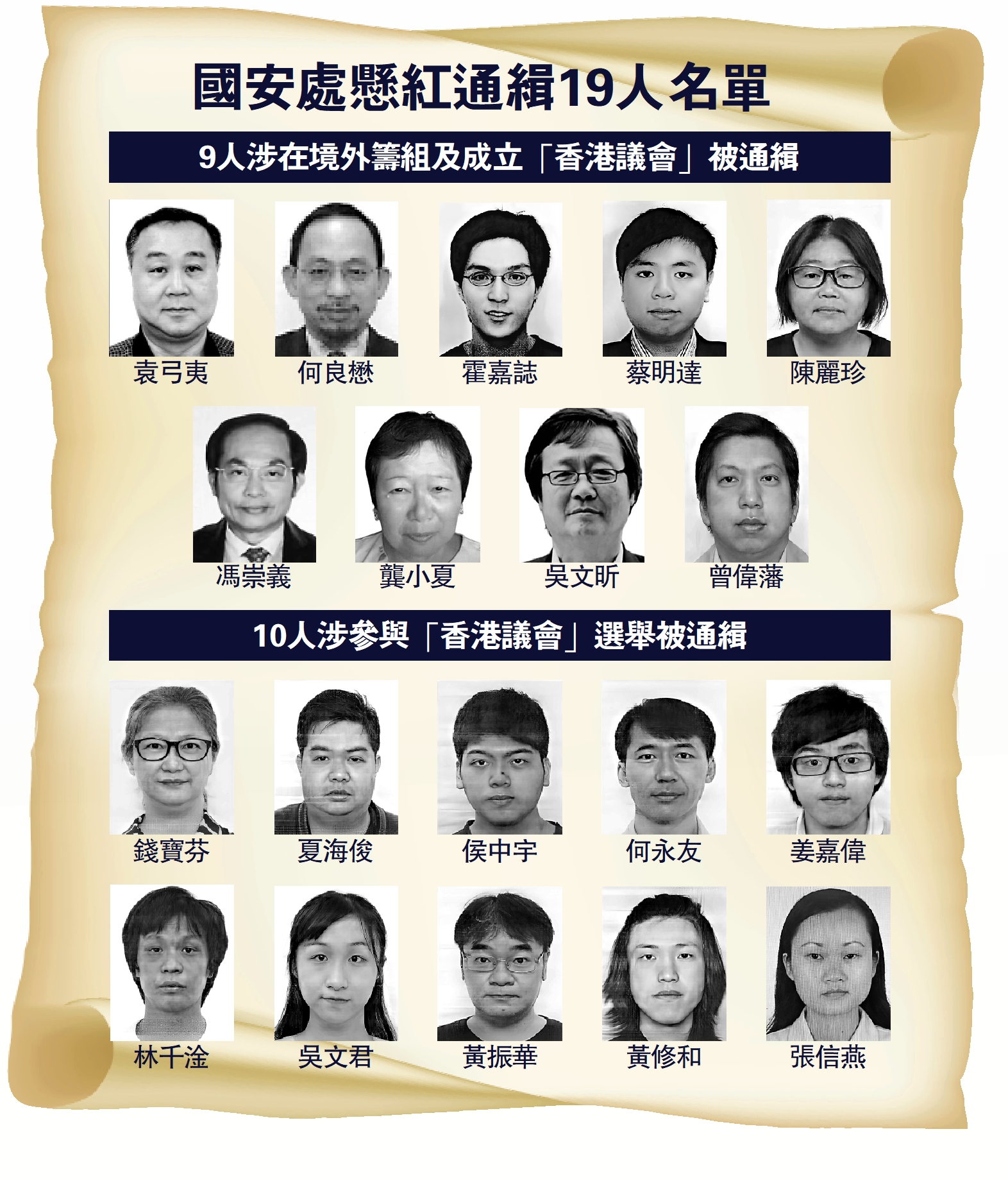 被通緝者當中9人涉嫌在境外成立顛覆組織,包括袁弓夷(男)、何良懋(男)、霍嘉誌(男)、蔡明達(男)、陳麗珍(女)、馮崇義(男)、龔小夏(女)、吳文昕(男)及曾偉藩(男),在香港境外組織「香港議會」選舉以成立所謂「香港議會」;其餘10人包括錢寶芬(女)、夏海俊(男)、侯中宇(男)、何永友(男)、姜嘉偉(男)、林千淦(男)、吳文君(女)、黃振華(男)、黃修和(男)及張信燕(女),作為候選人參與「香港議會」選舉,並在當選後宣誓就任所謂「香港議會議員」。