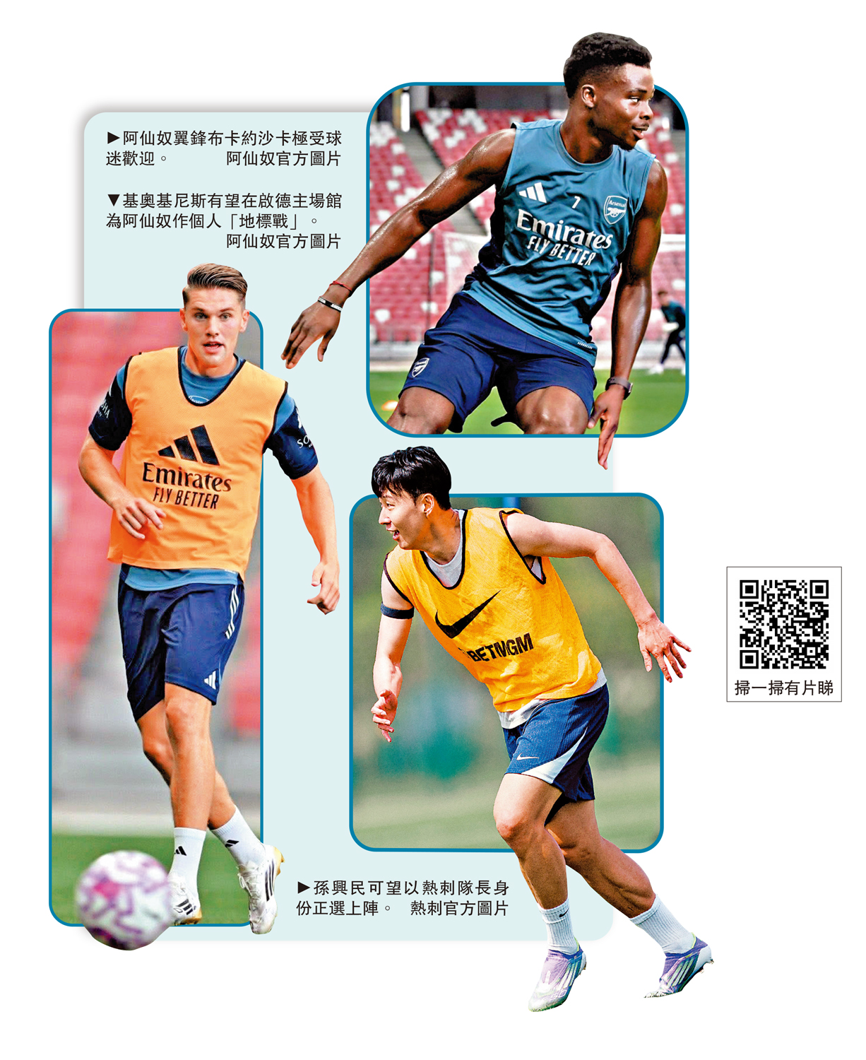昨晚的公開訓練約1小時,球員「交足功課」,從熱身到分組對抗均十分認真。同時,球員在射門練習中刻意靠近邊線,讓觀眾近距離欣賞技術,工作人員亦派發紀念品,現場氣氛高漲。除基奧基尼斯,中場迪格蘭賴斯和翼鋒沙卡同樣受到現場球迷的熱情歡迎。