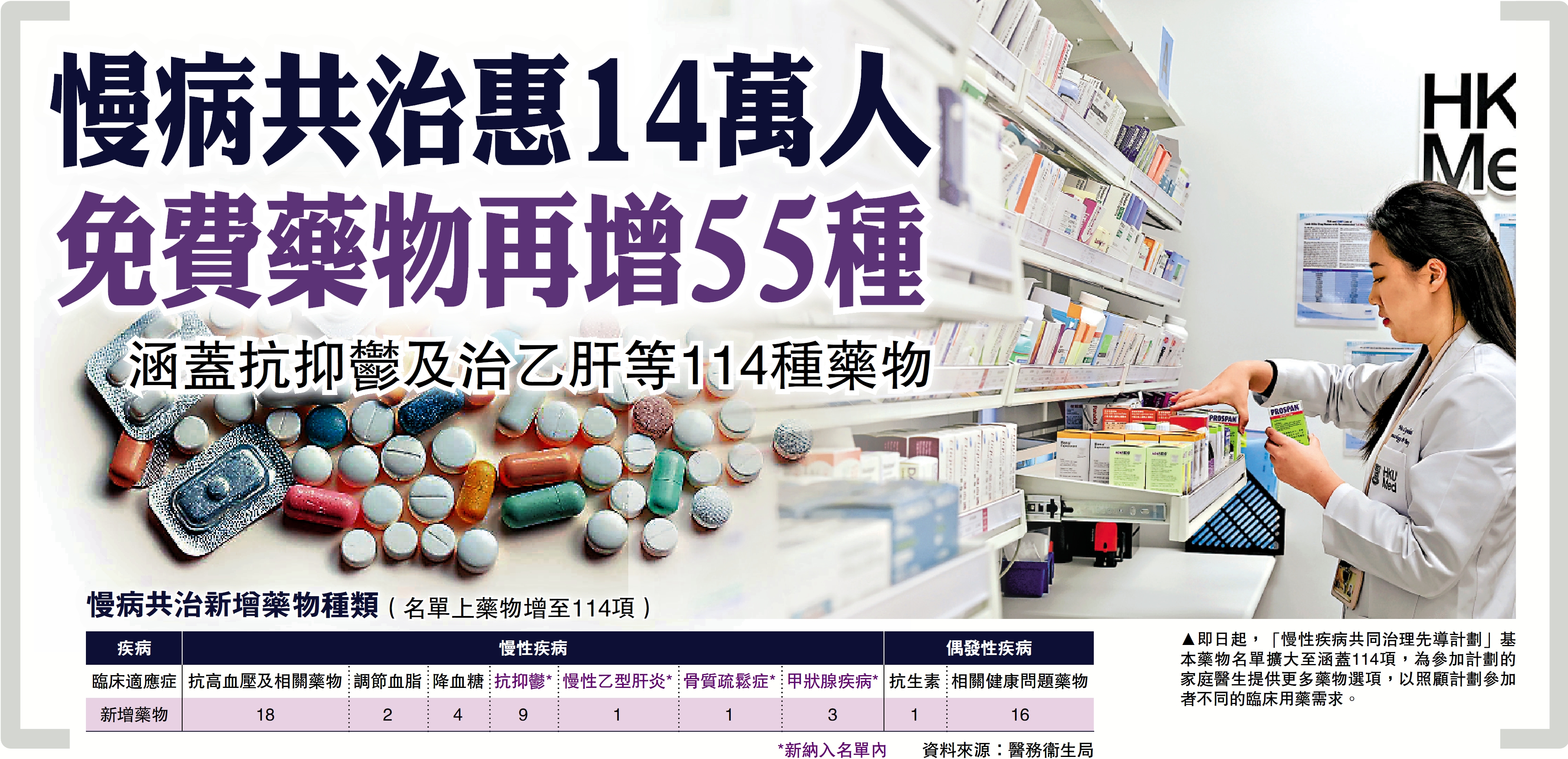 醫衞局昨日公布,「慢病共治計劃」基本藥物名單即日起新增55項藥物,包括新增抗抑鬱藥等藥物,並增加更多針對偶發性疾病相關健康問題的藥物,例如紓緩哮喘和痛風、緩解噁心和眩暈的藥物。名單所列藥物是未來社區藥物名冊的基礎部分。