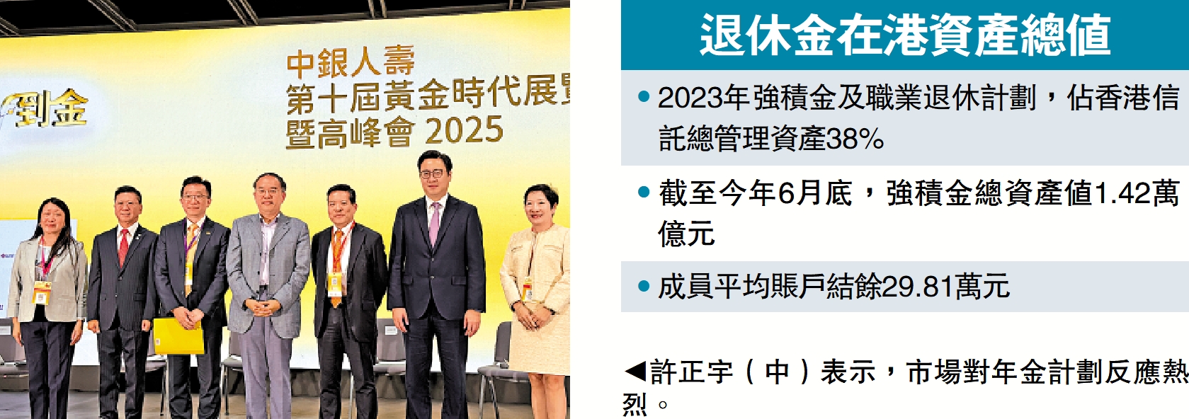 強積金方面,許正宇表示,香港退休保障的核心支柱離不開該制度。截至去年年底,全港由60歲及以上人士持有的強積金賬戶約有150萬個,總資產達1800億元,佔強積金總資產的14%。