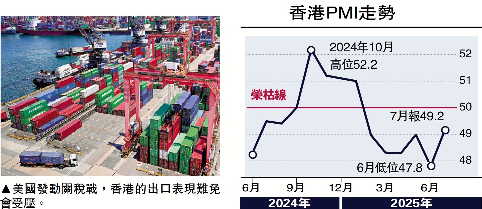 【大公報訊】面對關稅影響及地緣政局不穩,標普全球7月香港採購經理指數(PMI)為49.2,按月升1.4個百分點,創6個月新高,但亦是連續6個月處於收縮區。商會人士坦言,美國對全球發動關稅戰,令市場出現混亂,也削弱需求,料未來一、兩年仍挑戰不斷。另有商會人士期望,新一份施政報告能提出更多措施,協助港商拓展美國以外的市場,也要設法「搞旺香港消費」。