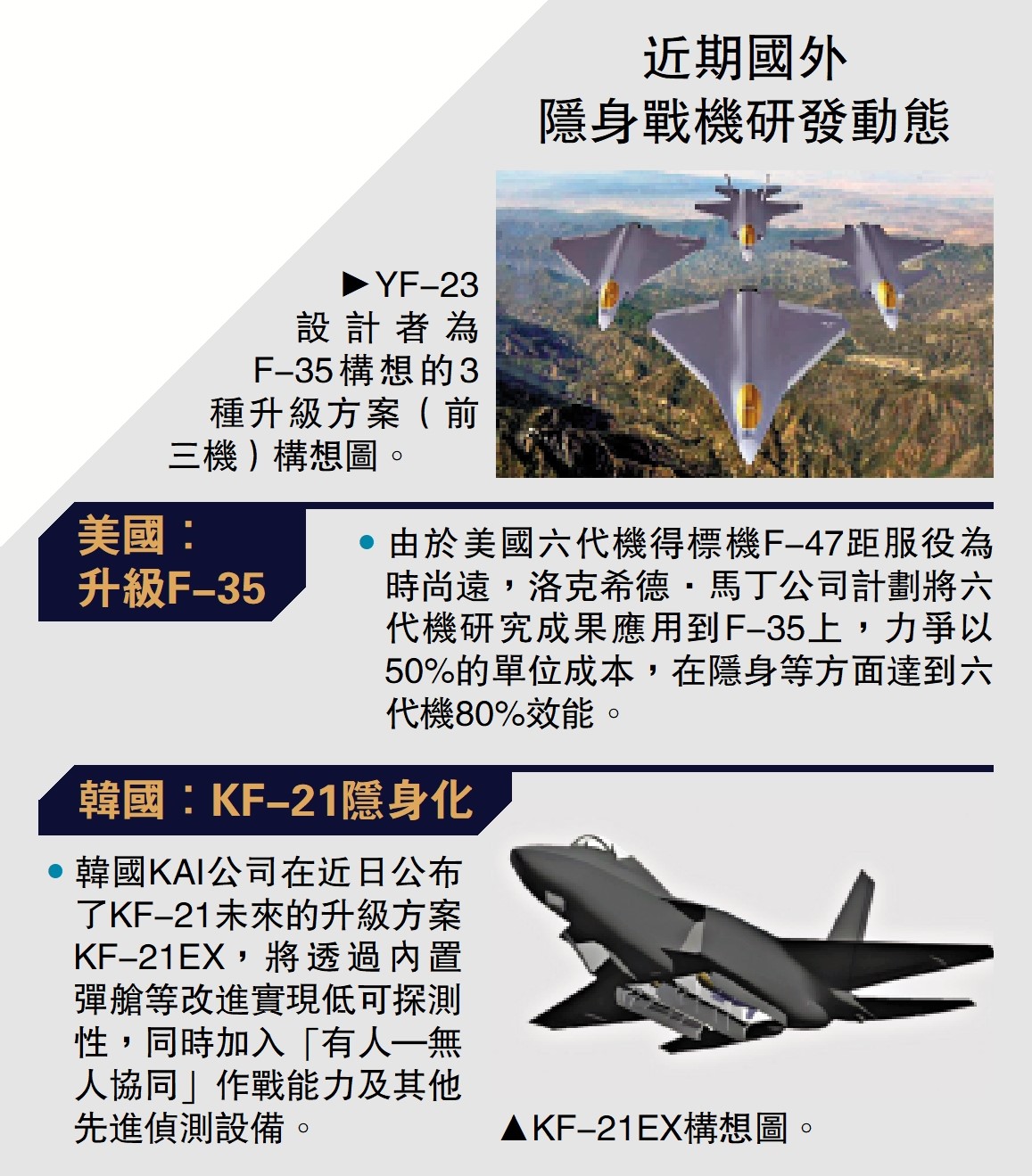 •由於美國六代機得標機F-47距服役為時尚遠,洛克希德·馬丁公司計劃將六代機研究成果應用到F-35上,力爭以50%的單位成本,在隱身等方面達到六代機80%效能。