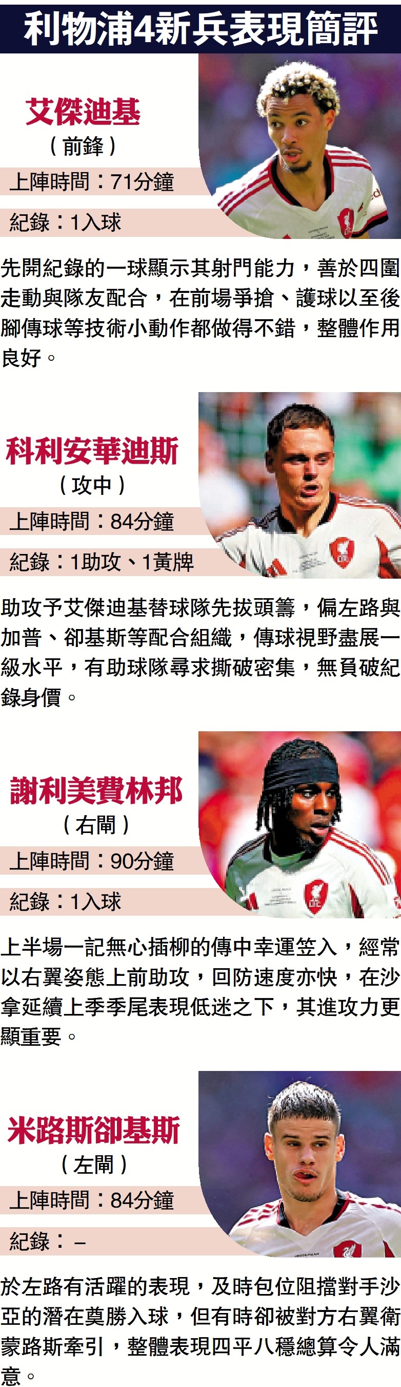 助攻予艾傑迪基替球隊先拔頭籌,偏左路與加普、卻基斯等配合組織,傳球視野盡展一級水平,有助球隊尋求撕破密集,無負破紀錄身價。