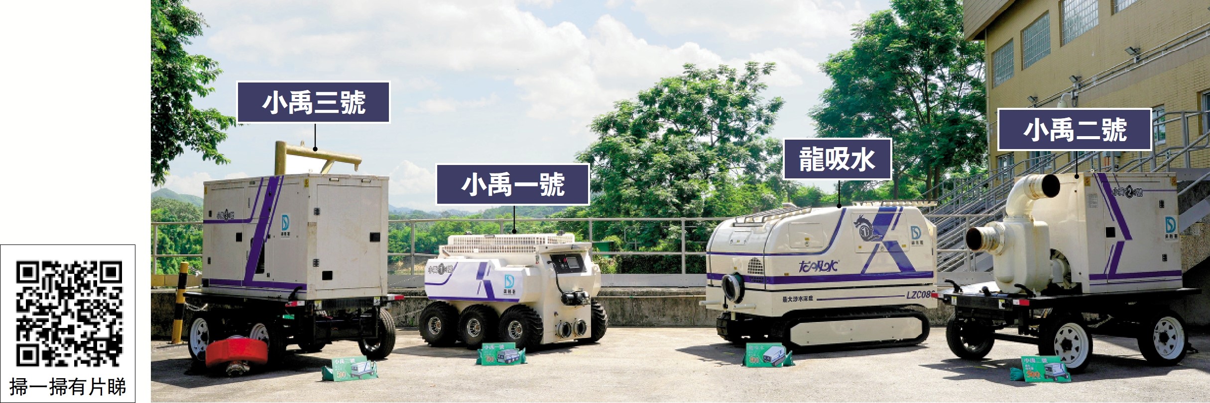 極端天氣頻發,本港早前於八日內四度發出黑色暴雨警告信號,黑雨期間全港各區有數十宗水浸事故。渠務署今年初先後引入六部排水機械人,包括三部「龍吸水」與三部「小禹」,在黑雨期間四出協助處理嚴重水浸,今個雨季以來,合共出動了約500小時,成效顯著。