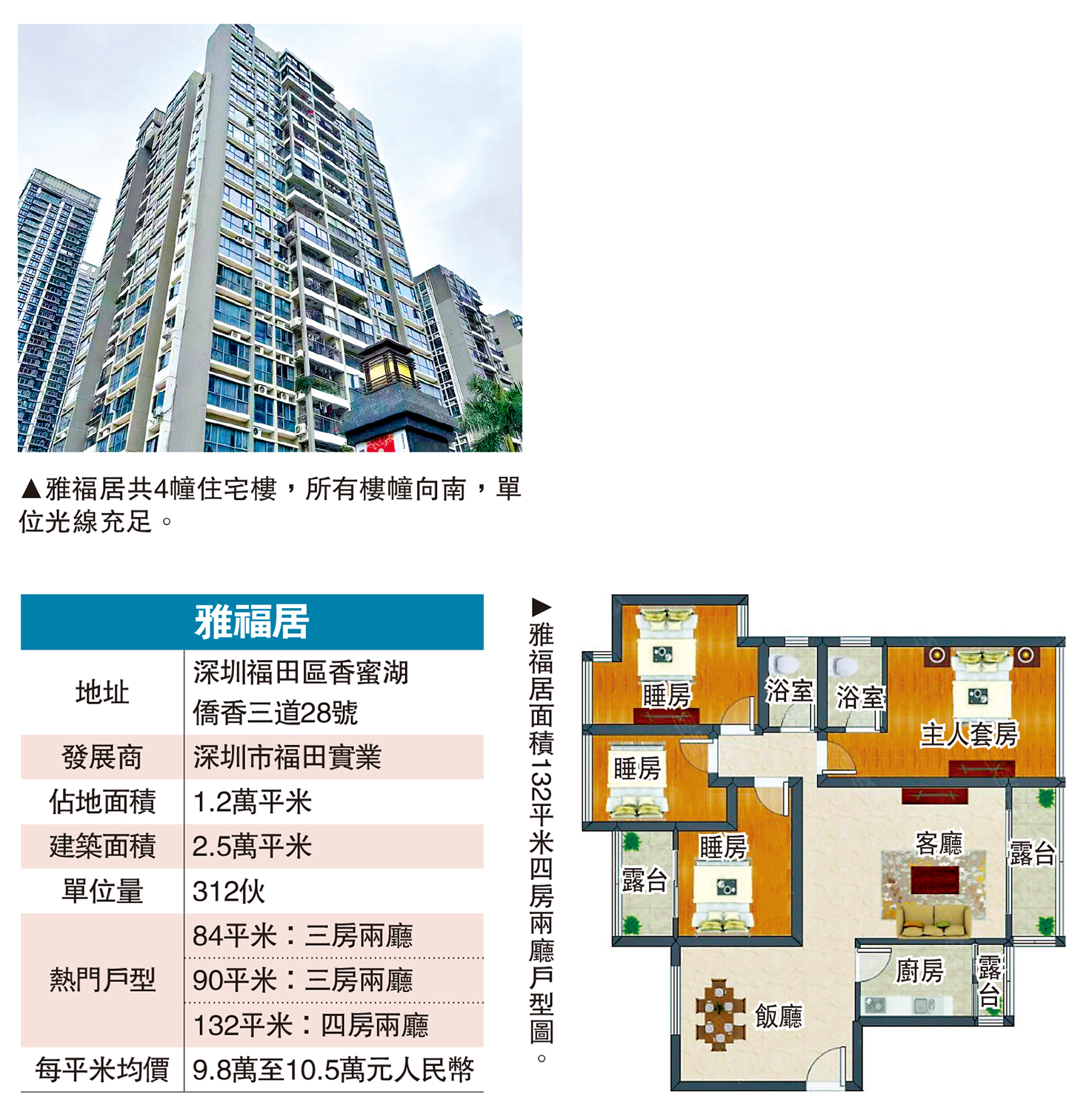 據樂有家7月掛牌,雅福居三房南向中高層單位普遍每平米9.8萬至10.5萬元(人民幣,下同),總價850萬至950萬元;132平米四房戶1300萬至1400萬元。