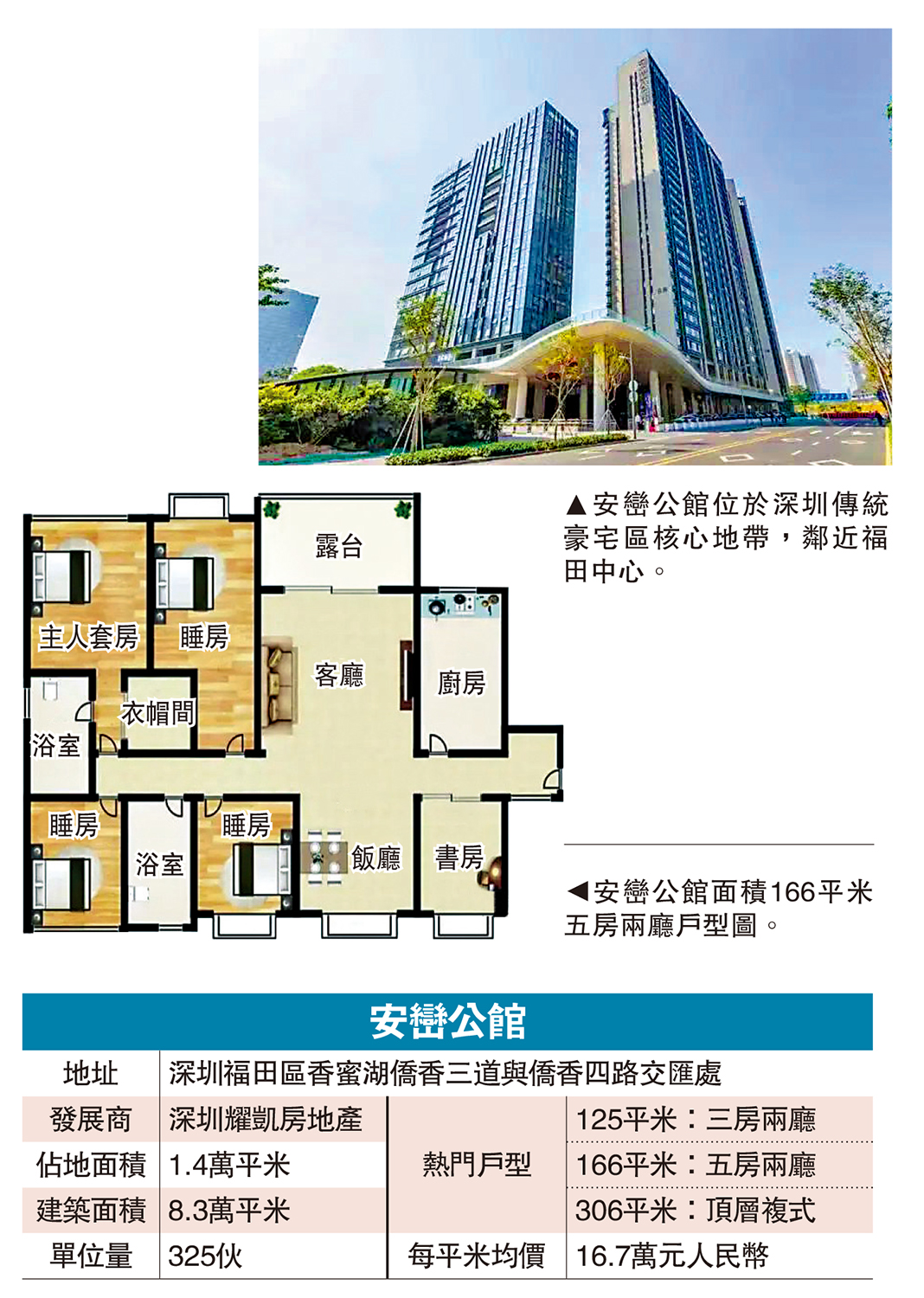 安巒公館二手掛牌每平米均價16.7萬元(人民幣,下同),看似不低,但比周邊親民,相鄰的萬科瑧山府四房總價已破3000萬元,而安巒公館166平米五房戶總價約2800萬元(約3060萬港元)。更划算的是租售比,65平米兩房月租約1.1萬元,按首付三成計算,月供比租金僅多5000元。