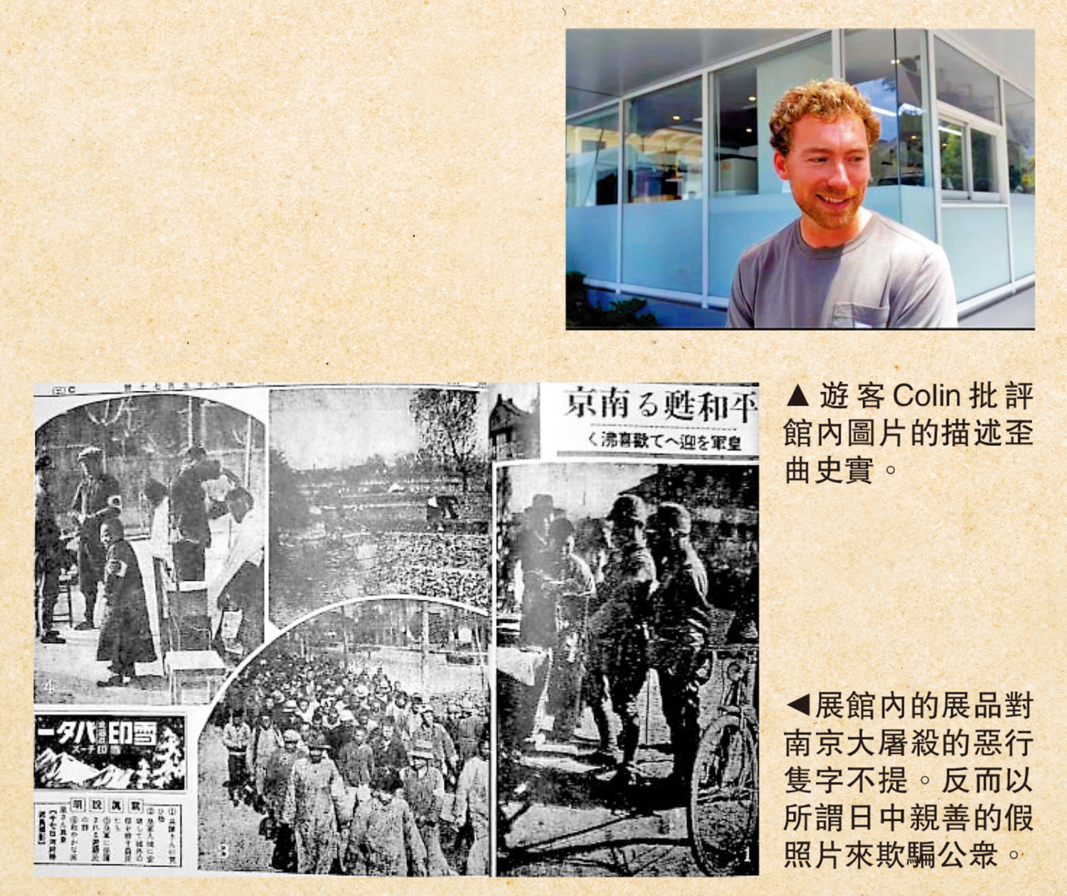 對於日軍佔領南京,展板上遍布謊言,採用當時日本媒體刊登的所謂「日中親善」的假照片,來製造日軍佔領南京城後市內和平的假象。更令人氣憤的是,對於侵華日軍野蠻入侵南京後,瘋狂殺戮30萬人,卻隻字不提,僅以「南京事件」輕描淡寫地帶過。