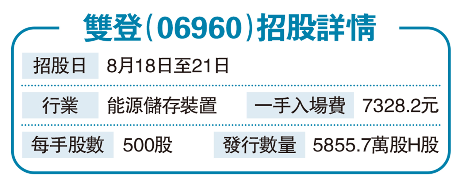 【大公報訊】儲能電池廠商雙登股份(06960)作為人工智能數據中心(AIDC)儲能第一股,昨日起至周四(21日)招股,計劃發行5855.7萬股H股,10%於香港作公開發售,以發售價每股14.5元計,集資最多8.5億元。每手500股,一手入場費約7328.2元。該公司於8月26日掛牌,中金公司、華泰國際、建銀國際為其聯席保薦人。