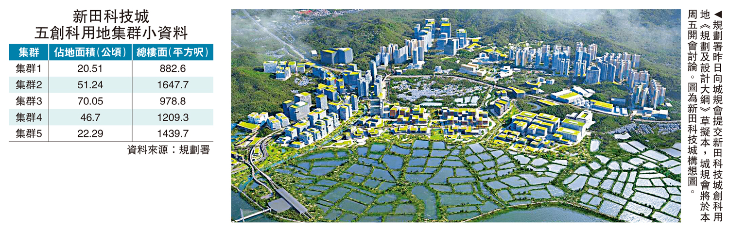 北部都會區發展持續推進,規劃署昨日向城規會提交新田科技城創科用地《規劃及設計大綱》草擬本,其中210公頃創科用地按位置和特質分為五個集群,詳列每個集群的主要用途、配套設施、概括規劃參數,以及規劃和城市設計要求,預料可提供逾6100萬平方呎樓面,並提供約6400伙人才公寓。城規會將於本周五(22日)開會討論。\大公報記者 曾敏捷