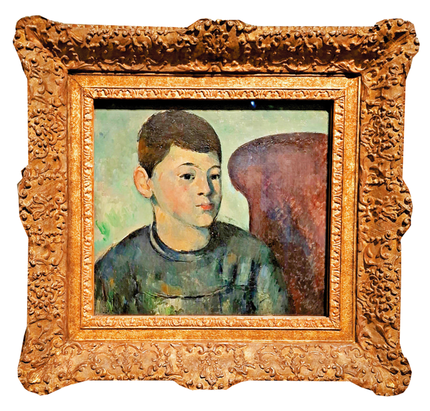 我再三觀看的一幅畫作是《畫家兒子的肖像》。九歲左右的兒子保羅坐在扶手椅上,臉孔稍微側向,肩頭與椅背連成畫面對角,一半是牆身的明亮,一半是上衣和椅背的暗沉,這對比突出了保羅的臉孔和頸項。在這少年的半身像上,你也許看到了些什麼:活潑?沉靜?稚氣?又或許看不出什麼。觀畫的人難免會問:「這樣畫出保羅就足夠嗎?」