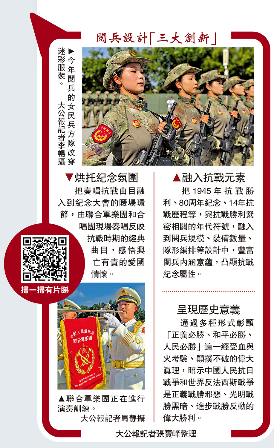 把1945年抗戰勝利、80周年紀念、14年抗戰歷程等,與抗戰勝利緊密相關的年代符號,融入到閱兵規模、裝備數量、隊形編排等設計中,豐富閱兵內涵意蘊,凸顯抗戰紀念屬性。