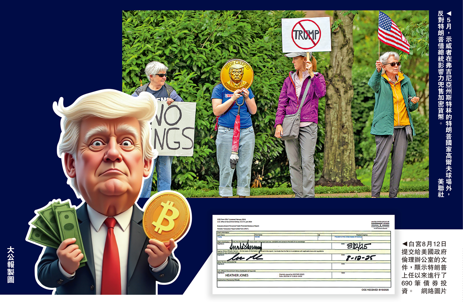 特朗普曾抨擊加密貨幣可能是一場「災難」,但他在2022年轉變態度,除了發行NFT產品(非同質化代幣)外,去年競選期間公開擁抱加密貨幣。今年1月,特朗普在就職典禮前,正式推出自己名字的迷因幣「特朗普幣」($TRUMP),其價格急升600%後狂跌,一度引發「割韭菜」的質疑。他重返白宮後出台多項政策,包括下令建立戰略比特幣儲備,聲稱要讓美國成為「全球加密貨幣中心」,7月簽署美國首個監管穩定幣的法案等等。