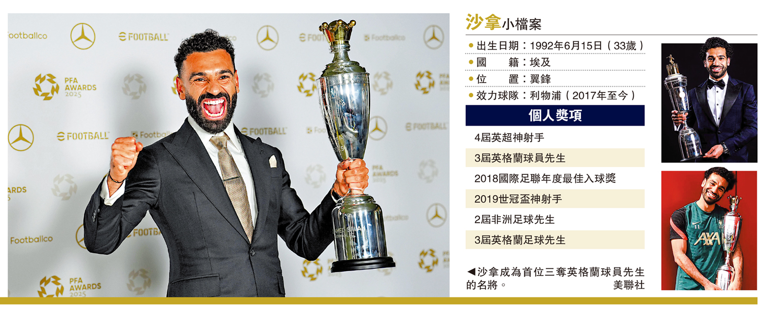 英格蘭職業足球運動員協會(PFA)周二晚上舉行頒獎典禮,公布上個球季的各個獎項,其中33歲利物浦首席射手穆罕默德沙拿,榮膺英格蘭球員先生,即最佳男子球員獎,這是這名埃及翼鋒第三度贏得這個獎項。當大家去季仍對沙拿充滿質疑,利物浦仍然與他續約兩年至2027年夏天,令他成為英超其中一位最高薪球員,他在開鑼戰亦以一個入球反駁外界的批評,就算沙特豪門出三倍工資,沙拿都留下來,他表示3次獲獎是永不忘記的時刻。\大公報記者 梁潤森
