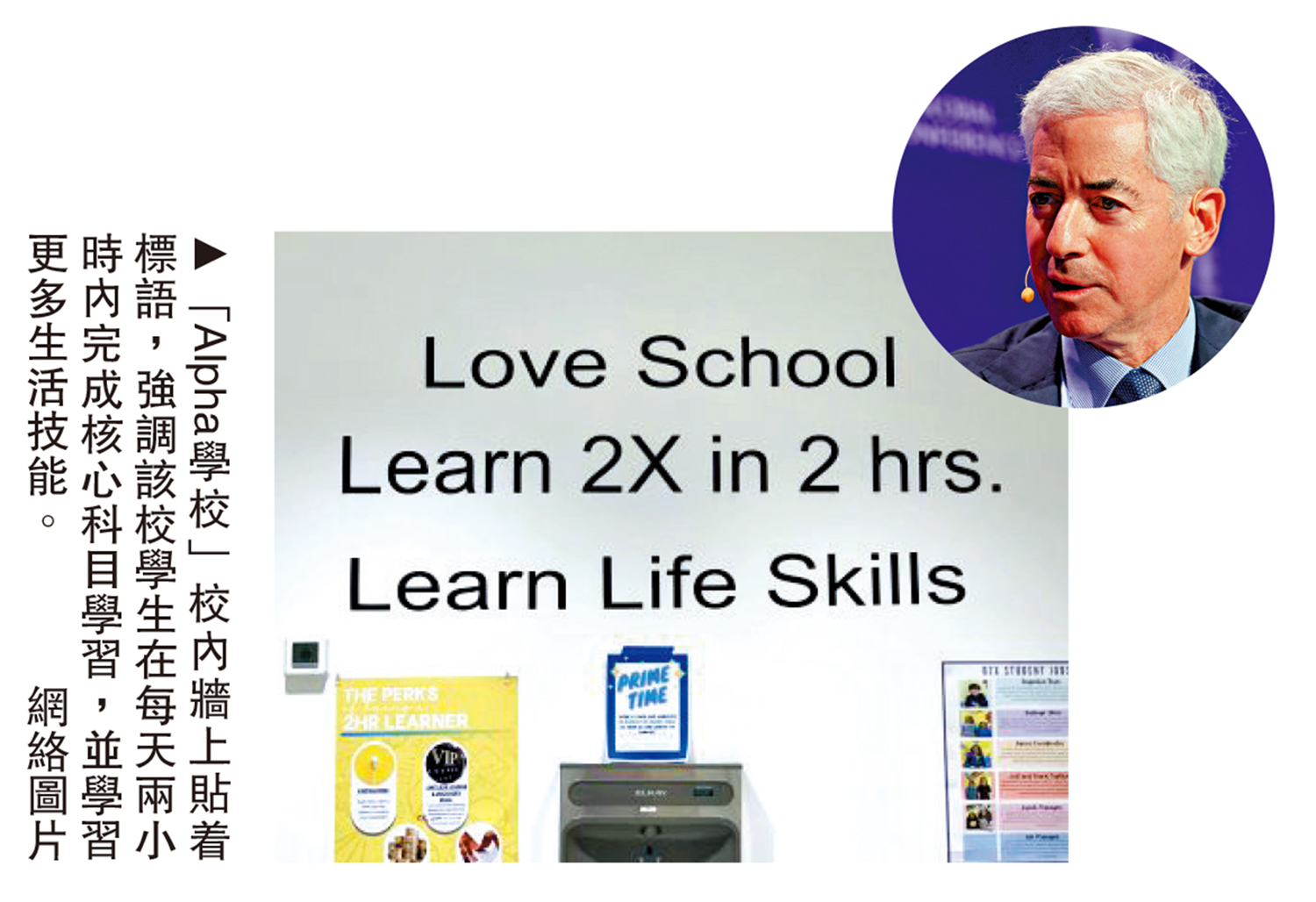 美國對沖基金大佬阿克曼(圓圖)20日發文公開支持「Alpha學校」,稱其是美國K-12(幼兒園至高中教育)「第一個真正突破性的創新」,並讚揚該校避開多元化、公平和包容性(DEI)的舉措。阿克曼的背書讓「Alpha學校」備受關注。支持者表示,「Alpha學校」的方法改變了傳統課堂模式,可以減輕壓力並培養學生內在,但批評者指出,「Alpha學校」的教育模式成效待驗證,加上該校每年學費最高達數萬美元,或僅是科技新貴家庭的高端教育實驗而已。