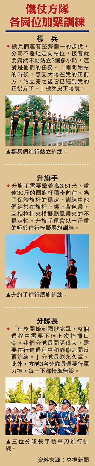 •「任務開始到國歌完畢,整個過程中需要下達七次指揮口令。我們分隊長間隔很大,需要在行進過程中和靜態之間反覆訓練。」分隊長劉永久說。此外,方隊3名分隊長還要行軍刀禮,每一下都精準無誤。