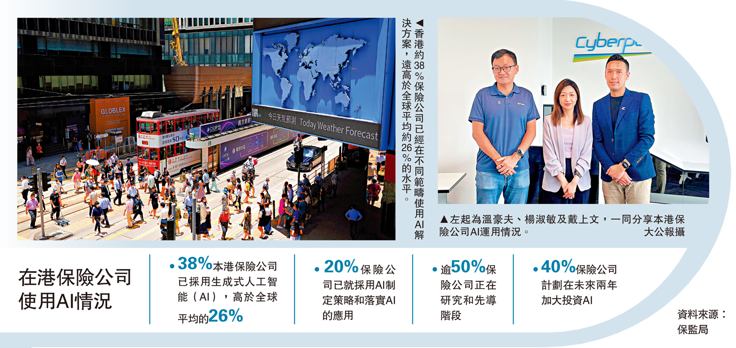 香港正在積極推動人工智能(AI)於金融及保險行業的應用。保監局早前啟動「人工智能促進計劃」,並提出將香港建設成為保險公司的「AI之家」,讓本地成為亞太地區AI保險及金融技術的試驗與發展重心。保監局政策及發展部高級經理楊淑敏表示,據年初調查,香港約38%保險公司已經在不同範疇使用AI解決方案,遠高於全球平均約26%的水平,四成受訪保險公司更表明計劃在未來進一步加大AI投資。/大公報記者 邵淑芬