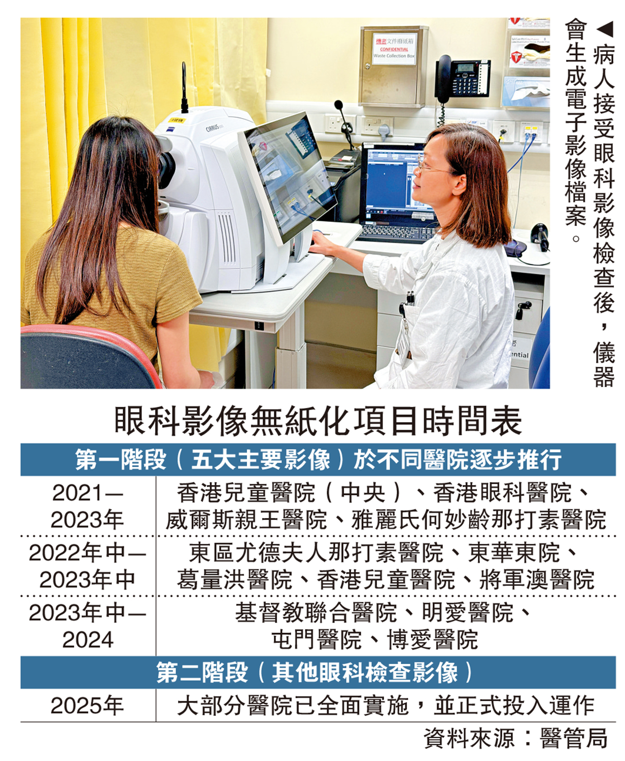 醫管局自2021年開始推動「眼科影像無紙化項目」,在醫管局中央及12間眼科專科門診診所安裝眼科影像儲存與傳輸系統(PACS),整合超過250部眼科檢查相關影像儀器,涉及每年處理200萬至300萬個影像傳輸,經過五年的努力,第一階段已於2024年第一季順利完成。