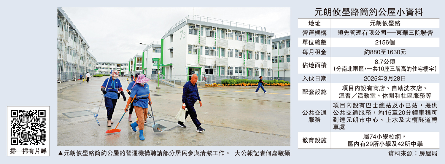 元朗攸壆路是首個「簡約公屋」項目,今年3月底開始分階段入伙,跨區搬到這裏的居民是否需要重新找工作?在當區找工作是否困難?有居民搬過來後,因為感到交通時間太長,於是辭掉原來工作,如今在社區內任職清潔工,實現「家門口上班」。元朗攸壆路簡約公屋的營運機構應房屋局要求,至今已協助30位居民實現社區內就業,更為居民與周邊廠家搭建就業橋樑,搭配其他社區支援服務,讓跨區遷入的住戶既「安居」亦「樂業」。