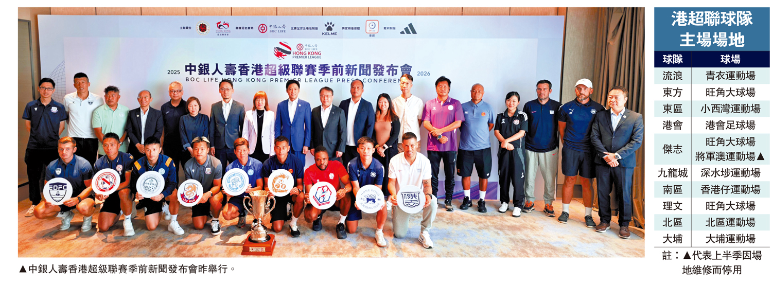 中國香港足球總會昨日舉行2025/2026中銀人壽香港超級聯賽季前新聞發布會,宣告新一季港超聯正式展開。本屆港超在東區升班後,增至10隊角逐,揭幕戰將於8月29日在旺角大球場上演,由東方對陣傑志。本屆賽事獲得新贊助商提供比賽用的專用足球,另外,當選每場賽事的最佳球員可獲獎金獎勵。足總總幹事張炎有表示,足總有意爭取更多賽事在啟德青年運動場舉行,除港超還包括盃賽決賽,目前仍有細節需要處理。\大公報記者 梁潤森