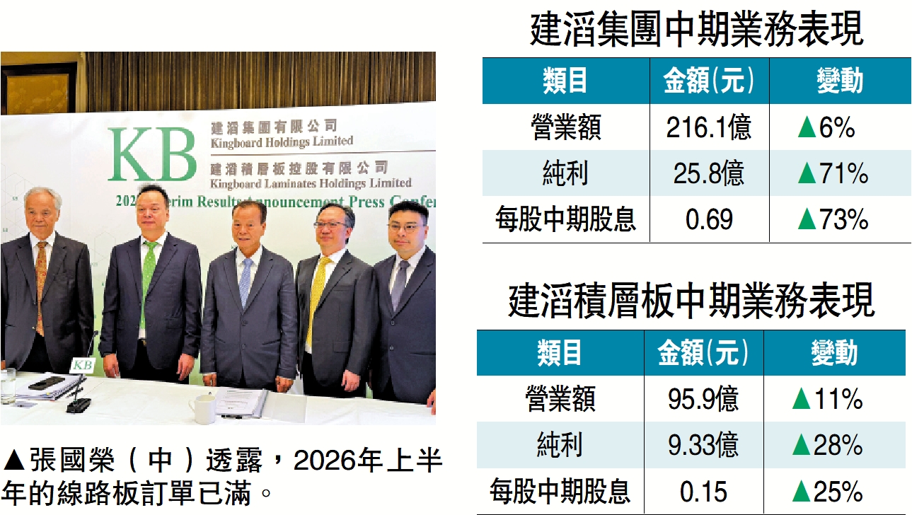 【大公報訊】建滔集團(00148)昨日公布2025年中期業績,上半年營業額按年增6%至216億元,純利激升71%至25.8億元,增派中期息73%至0.69元。期內整體電子市場需求暢旺,人工智能(AI)的發展亦帶動相關概念的電子產品需求強勁,令集團覆銅面板產品及印刷線路板產品的需求增長。同系覆銅面板生產商建滔積層板(01888)中期收入95.9億元,純利按年多28%至9.3億元,中期息較去年同期多派25%至每股0.15元。
