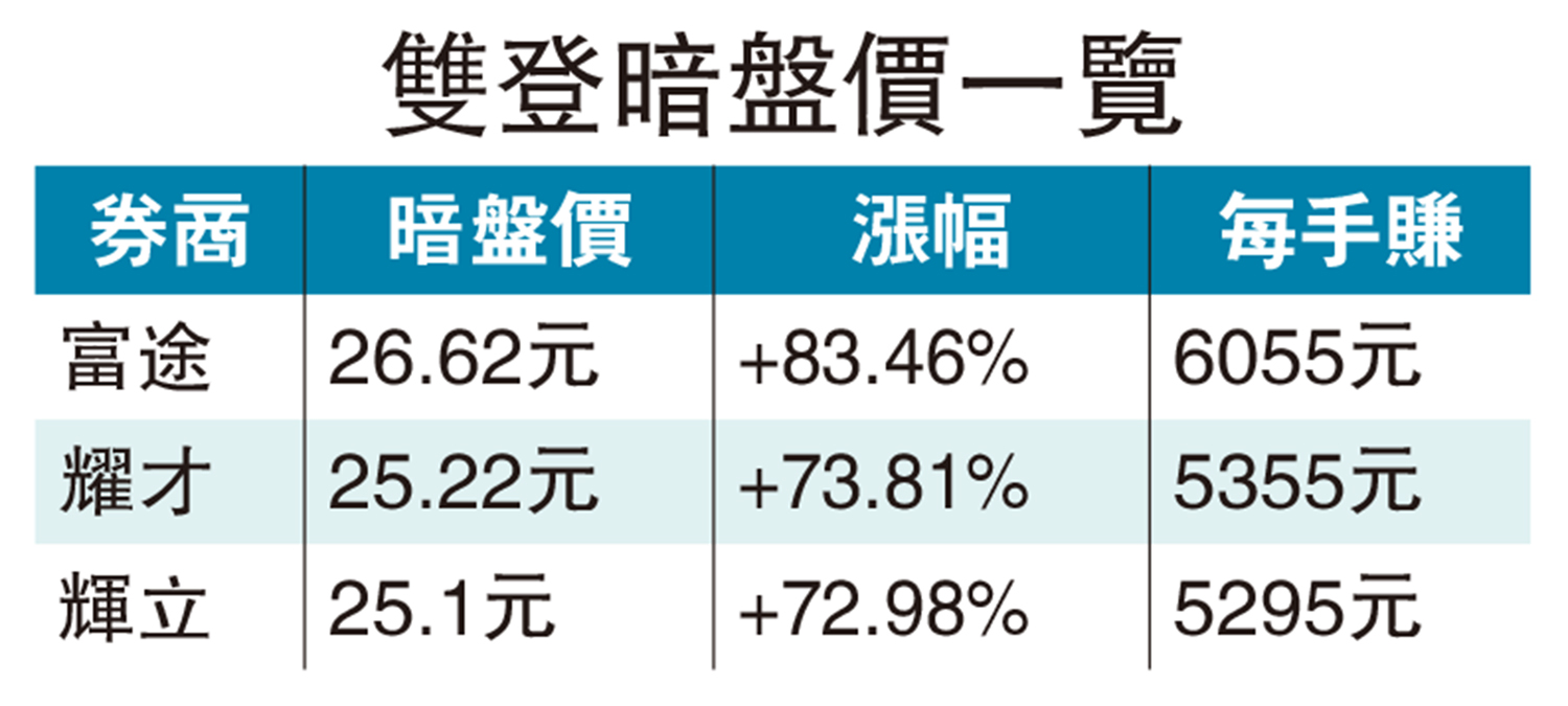 雙登股份在申購階段獲散戶踴躍認購,更帶旺暗盤表現。綜合三大暗盤市場,該股升幅收市價介乎25.1元至26.62元,升幅介乎72.98%至83.46%,以每手500股計,投資一手回報介乎5295元至6055元。