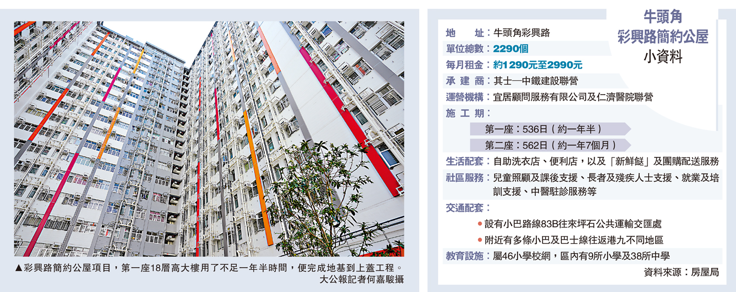 現屆政府致力興建簡約公屋,加快輪候公屋人士「上樓」。首個落成的高層簡約公屋──彩興路簡約公屋項目,第一座18層高大樓用了不足一年半時間,便完成地基到上蓋工程,創了香港高層最快興建紀錄。