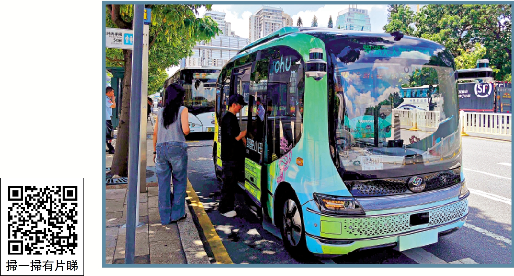據了解,港人透過香港九巴的App提前預約,也可在羅湖口岸搭乘無人駕駛小巴,免費體驗智慧出行。來自香港的陳女士拿着蓋好的「乘車紀念卡」笑着說:「候車站又涼快又貼心,連紀念卡都印着沿途地標,很有意義。」