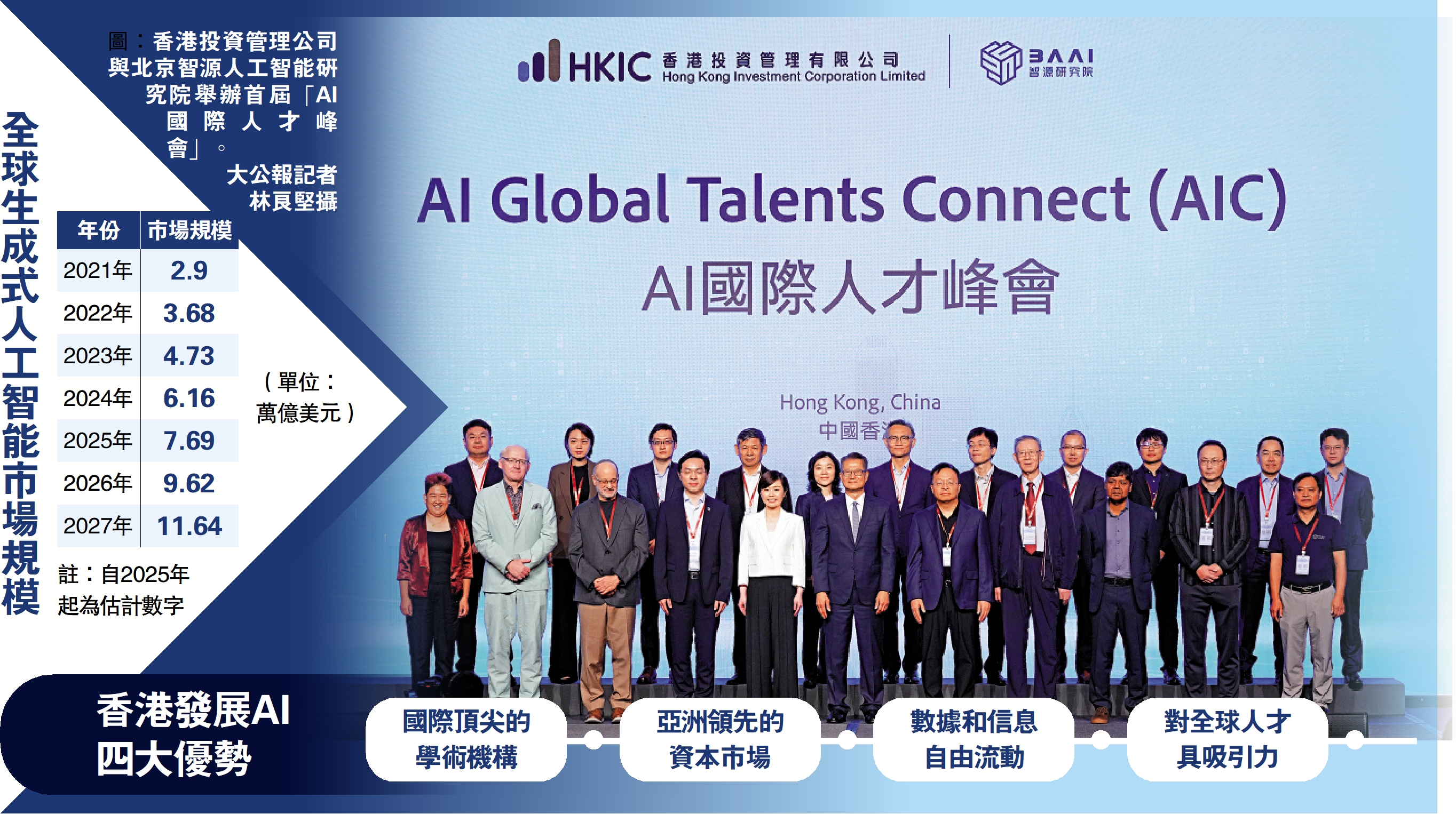 港投公司行政總裁陳家齊亦看好本港AI發展前景。她指出,香港作為「超級聯繫人」和「超級增值人」,絕對有能力引領推動人工智能投資與發展,憑藉「一國兩制」、法治體系、成熟的資本市場、資訊的自由流通、多元文化環境以及強而有力的支持政策等優勢,香港已成為吸引全球人工智能人才,以及促進人工智能投資與發展的理想平台。