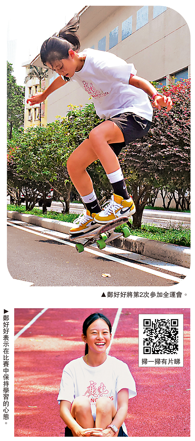 13歲的滑板少女鄭好好,去年以中國體育代表團最年輕運動員身份站上巴黎奧運會舞台。今年,她將迎來運動員生涯另一個重要時刻─在家鄉廣東惠州參加第15屆全運會滑板項目。面對即將到來的大賽,這位年輕選手昨日在廣東省二沙體育訓練中心接受訪問時自信地說:「最好的話,我希望可以拿冠軍。」\大公報記者 張銳廣州報道(文、圖)