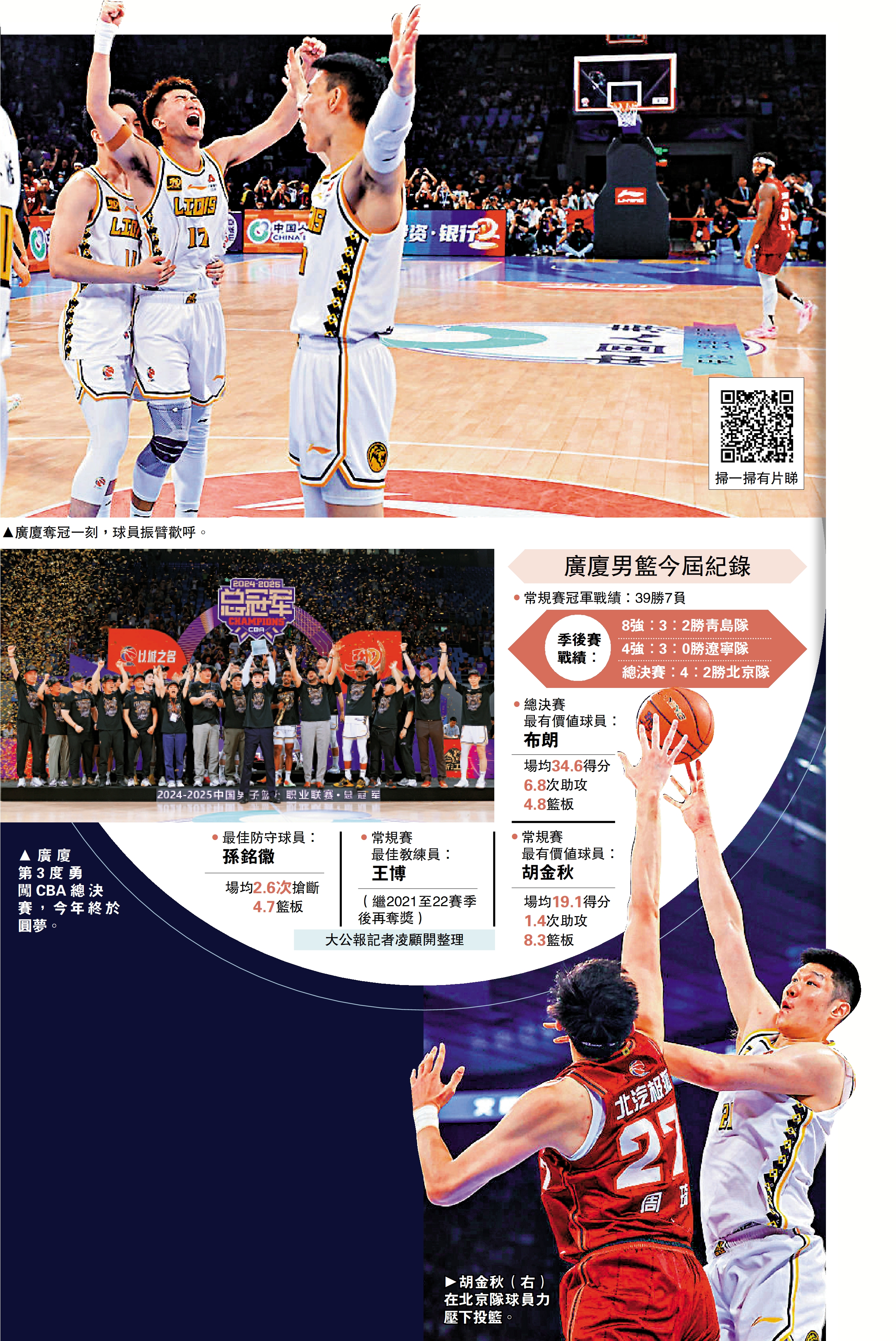 當朱俊龍命中關鍵三分球後,比賽已經失去懸念。終場哨響,廣廈球員們抱成一團,胡金秋、孫銘徽、朱俊龍流下激動的眼淚。回到更衣室,主教練王博用略帶哽咽的聲音嘶吼着:「我們是冠軍!」三進總決賽,兩次遭遇橫掃後,終獲隊史首冠。二十載的風雨兼程,甜蜜與苦澀,在這一刻交織。當璀璨的「金雨」在首都體育館傾瀉而下,中國男子籃球職業聯賽(CBA)迎來了第八支冠軍之師。在浙江廣廈籃球俱樂部成立二十周年之際,他們終成「新王」。
