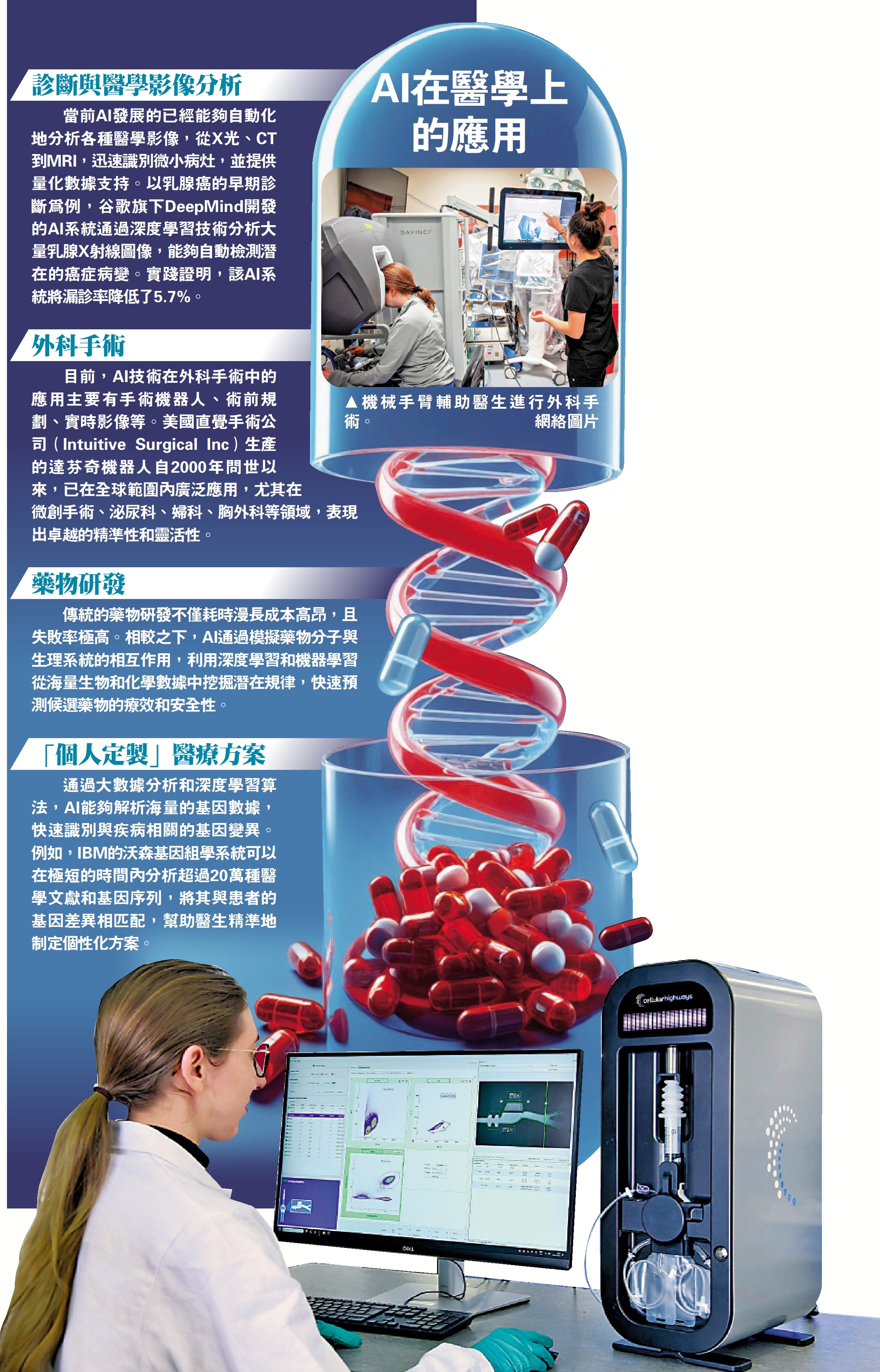 目前,AI技術在外科手術中的應用主要有手術機器人、術前規劃、實時影像等。美國直覺手術公司(Intuitive Surgical Inc)生產的達芬奇機器人自2000年問世以來,已在全球範圍內廣泛應用,尤其在微創手術、泌尿科、婦科、胸外科等領域,表現出卓越的精準性和靈活性。