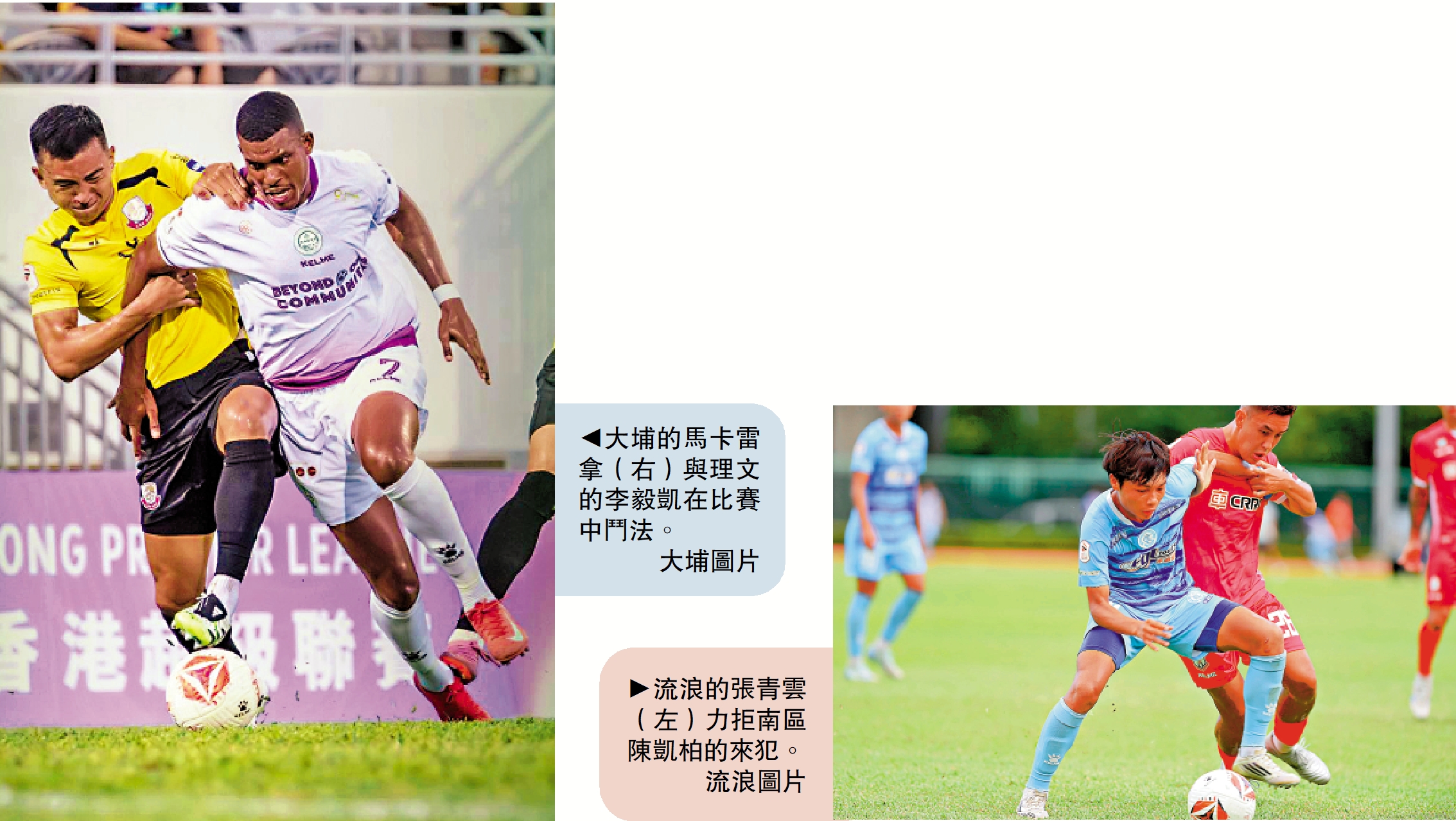 【大公報訊】記者朱家立報道:港超聯昨日結束兩場賽事,其中南區在主場迎戰流浪,後者在3分鐘內連入兩球,最終南區以1:2不敵,流浪取得聯賽「開門紅」。至於晚上的焦點戰則是理文對陣大埔,大埔一度領先至2:1,但在終場前理文憑藉韋利安的入球,最終以2:2逼平大埔,各取1分。