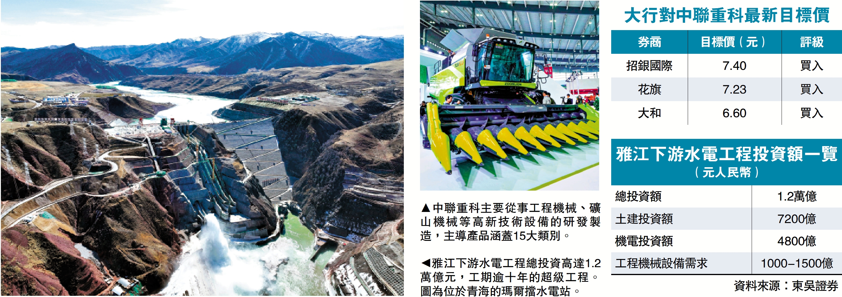 伍禮賢表示,中聯重科為業界巨頭之一,主要從事工程機械、礦山機械、農業機械等高新技術設備的研發製造,主導產品涵蓋15大類別。根據2024年年報資料,工程機械相關收入佔當年整體收入近九成,而工程機械之中,又再細分為混凝土機械、起重機械、高空機械、土方工程機械等細分領域,這些領域均有望在「雅魯藏布江」水電工程興建過程中受惠。同時,中聯重科近日亦在內地投資者互動平台表示,有望深度參與該水電項目建設的核心環節。