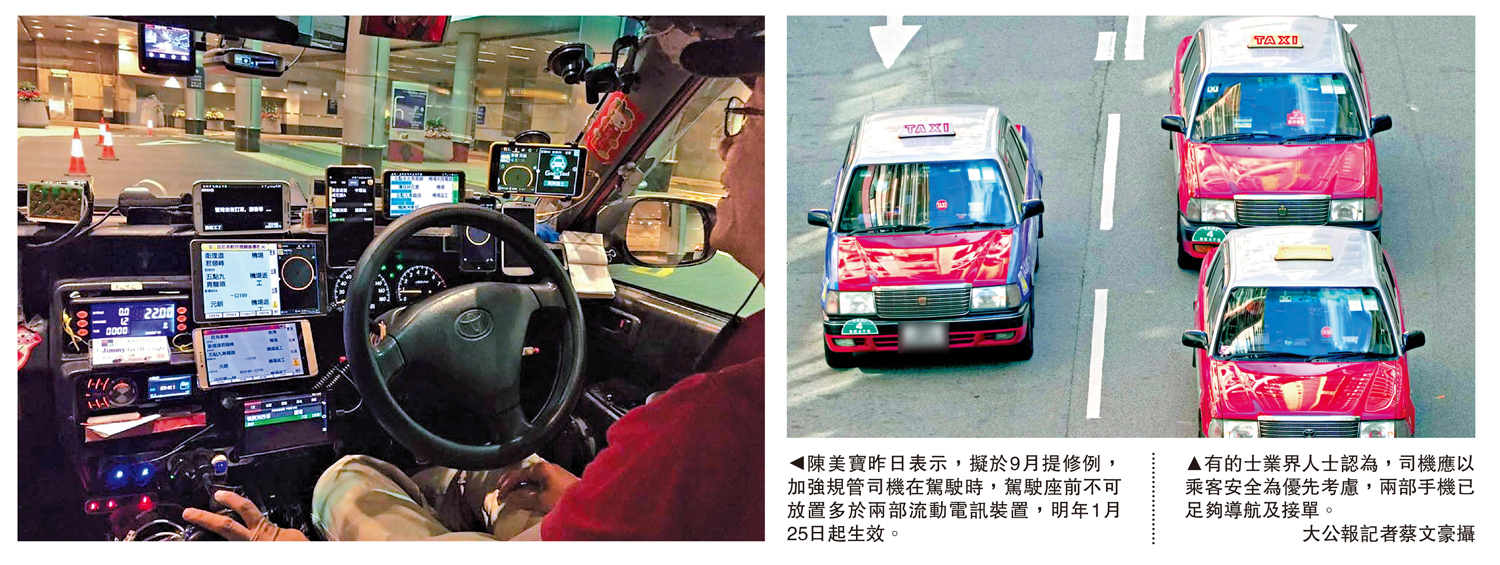 有的士業界人士認為,司機應以乘客安全為優先考慮,兩部手機已足夠導航及接單,「同時兼顧路況及看太多部手機,對乘客安全並非好事。」\大公報記者 伍軒沛