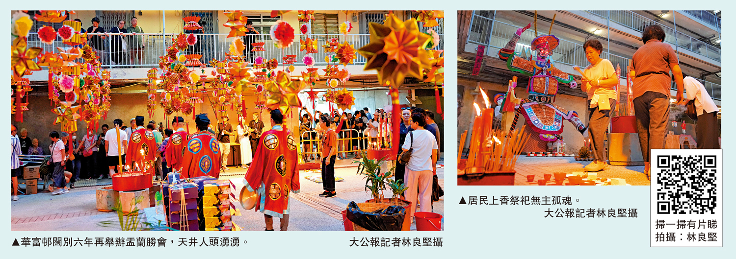 【大公報訊】記者肖泓宇報道:香港潮人盂蘭勝會於2011年列入國家級非物質文化遺產名錄,每逢農曆七月,香港不少地區都有盂蘭勝會。重建在即的華富邨,闊別六年,昨日再次舉辦盂蘭勝會,因該邨部分樓宇天井設計而獨有的「天井大王」重現,吸引大批街坊圍觀。