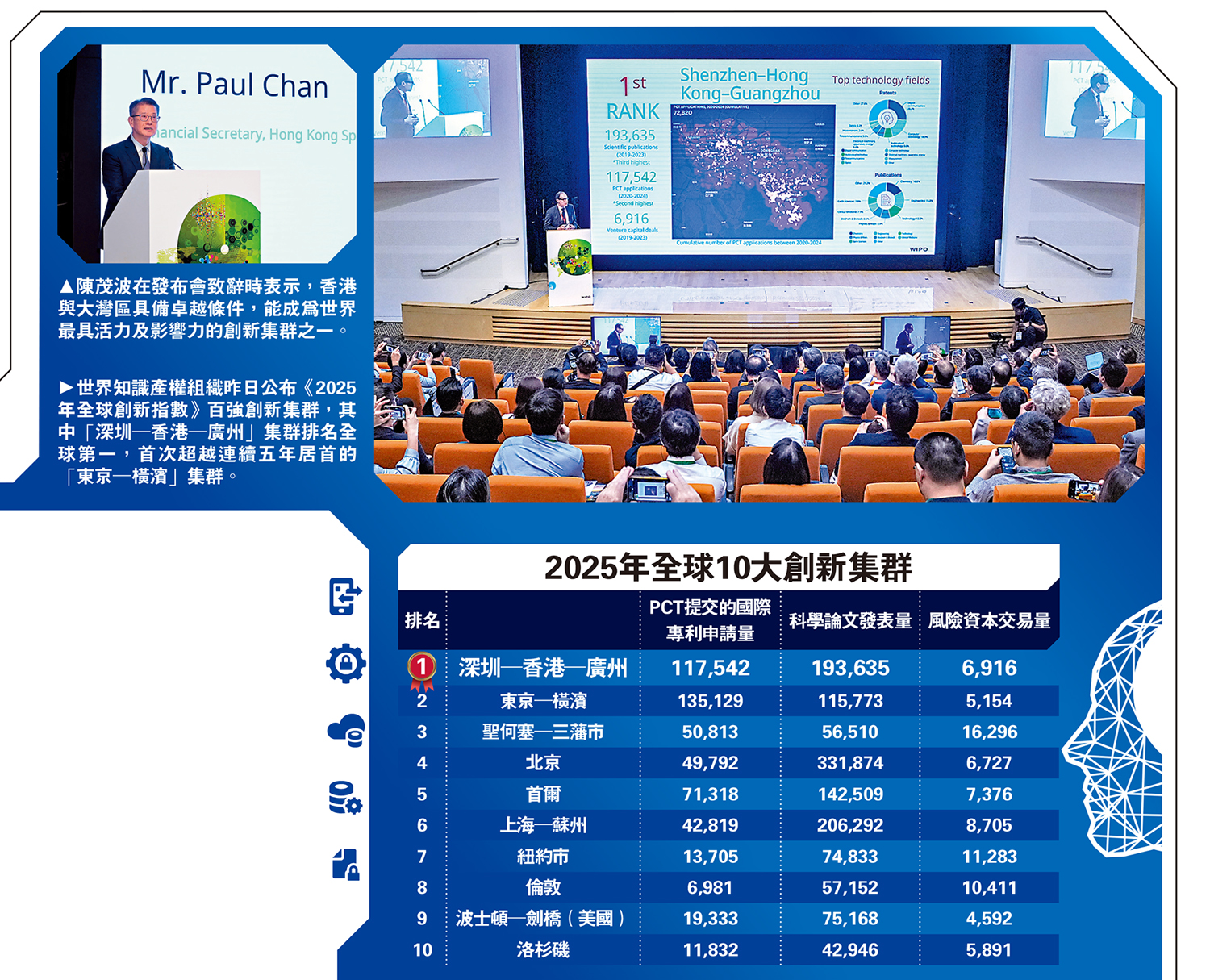 世界知識產權組織昨日公布《2025年全球創新指數》百強創新集群,「深圳─香港─廣州」集群排名全球第一,打破過去五年蟬聯第二紀錄。香港特別行政區政府發言人表示,世界知識產權組織公布的創新集群排名,反映粵港澳大灣區的創新能力在國際上獲得高度肯定。\大公報記者 江凌風(文) 蔡文豪(圖)