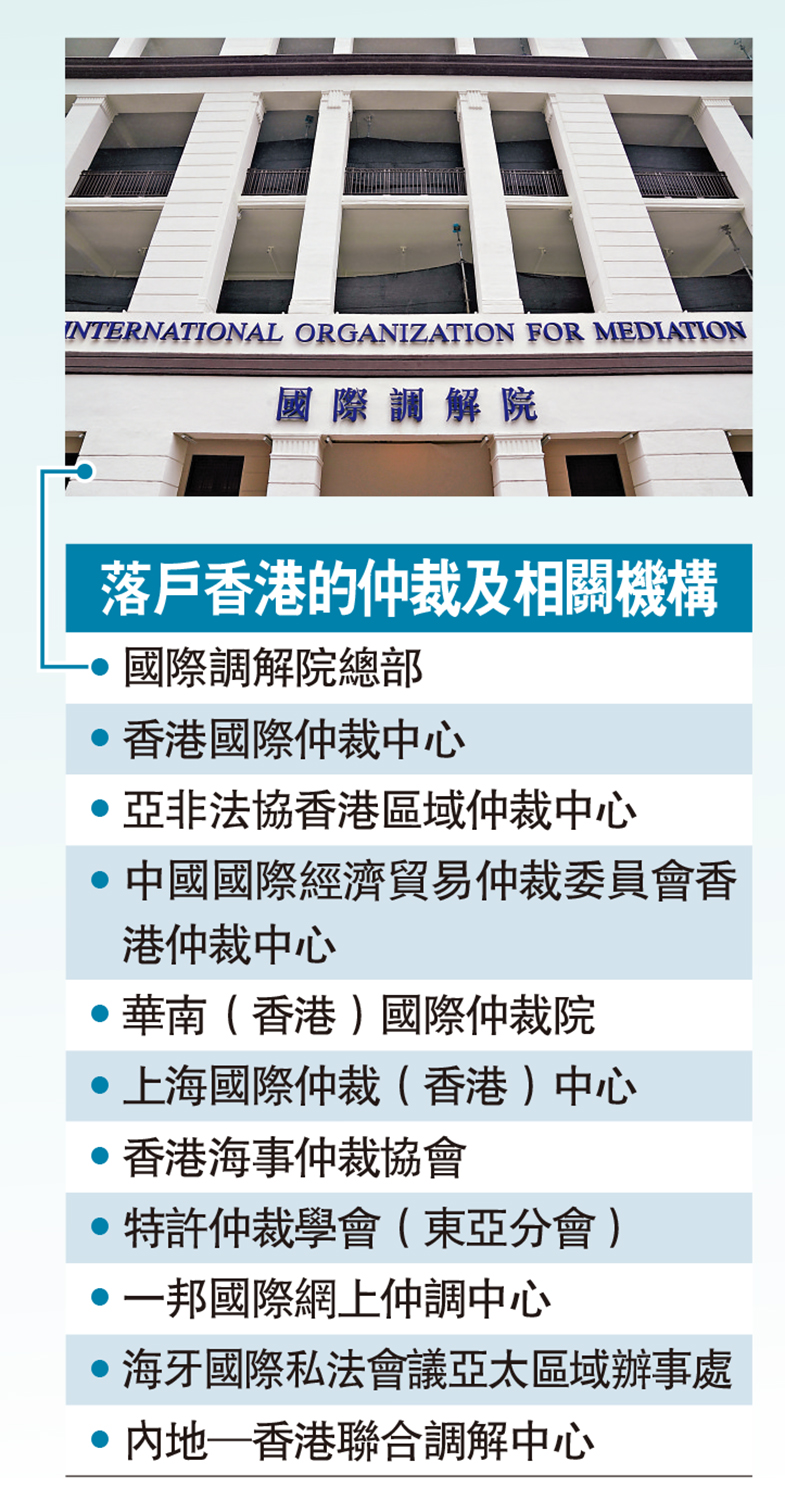 在各機構中,國際調解院總部落戶香港,盡顯香港在國際調解方面的獨特優勢,亦是國家大力支持香港在「十四五」規劃下建設亞太區國際法律及解決爭議服務中心的重要舉措,突出香港具有「背靠祖國、聯通世界」的獨有優勢,是國際與內地機構尋求國際法律和仲裁服務首選平台。
