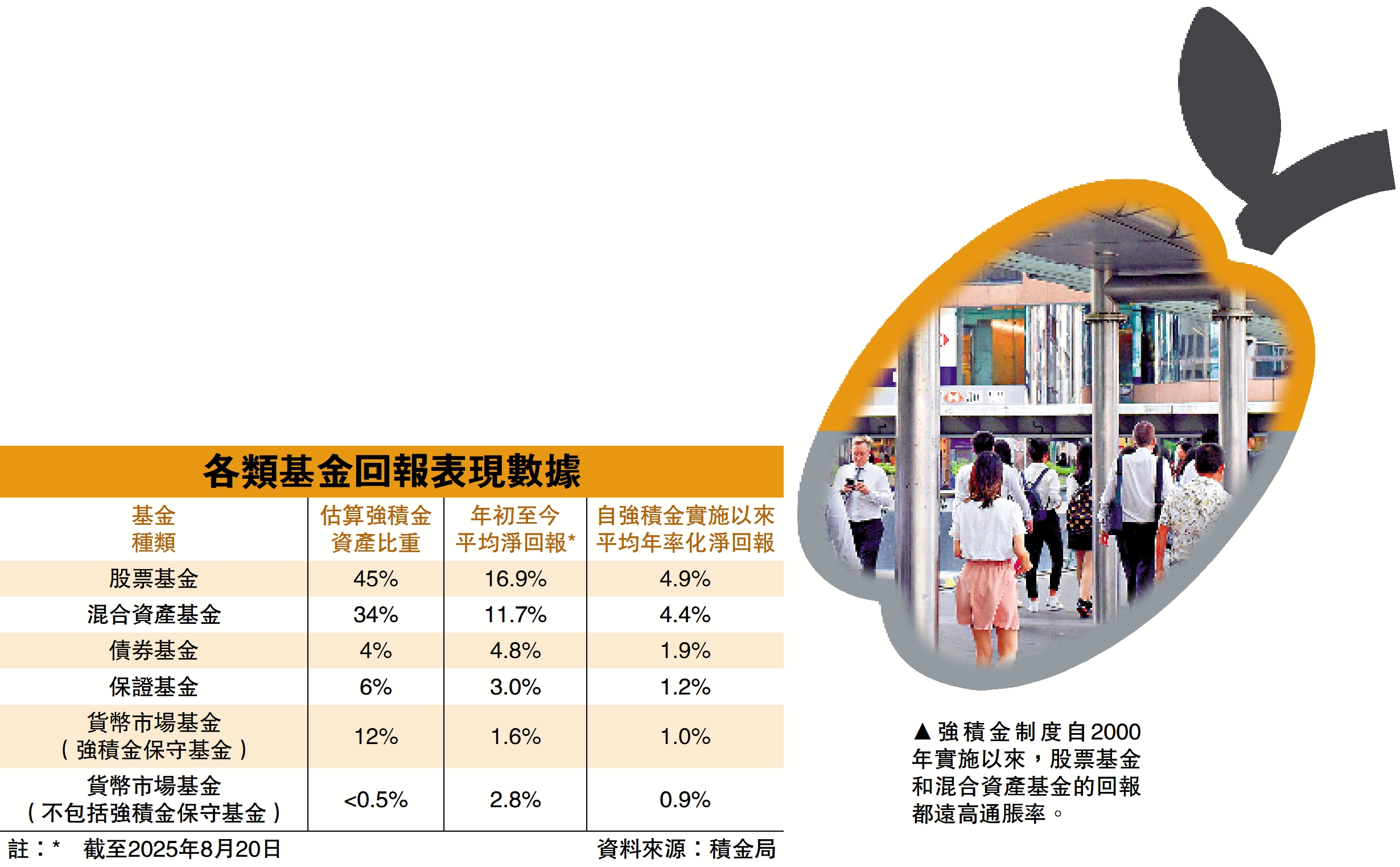 強積金在2025年繼續展現良好的投資表現,尤其是股票類基金表現突出,為計劃成員帶來可觀回報。根據積金局最新數據,今年截至8月20日,股票基金的平均淨回報高達16.9%,混合資產基金亦錄得11.7%的回報,兩類基金合共佔強積金總資產近八成。同期債券、保守及貨幣基金表現則相對穩健,介乎1.6%至4.8%升幅。