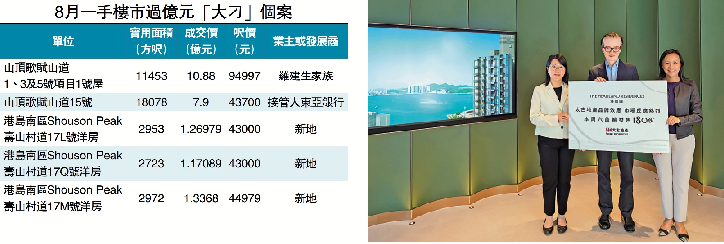 據一手成交紀錄冊及中原地產數據顯示,今年7月及8月一手住宅成交量連續兩個月突破2000宗,為2019年以來首次,反映買家信心回暖。一手豪宅市場火熱,8月份錄得最少87宗金額逾3000萬元成交,較7月的53宗大幅增加約六成。其中,樓價超過1億元的「大刁」高達13宗,按月倍增,並創下今年單月新高紀錄。最矚目的項目是針織商人羅建生家族持有的山頂歌賦山道1、3及5號豪宅項目,上月12日上載樓書後,不到兩周即錄得首宗成交,1號洋房以10.88億元沽出,實用面積11453方呎,呎價高達94997元,成為今年一手市場最大宗成交。