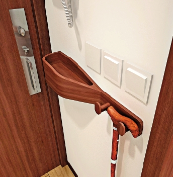 採納住戶意見,「盛頤居」新設兩項設計,包括在單位大門附近設置「出門三寶」收納架(圖),擺放枴杖、鎖匙及銀包等出門必需品;浴室設置晾衣架,有更多空間晾乾衣物。