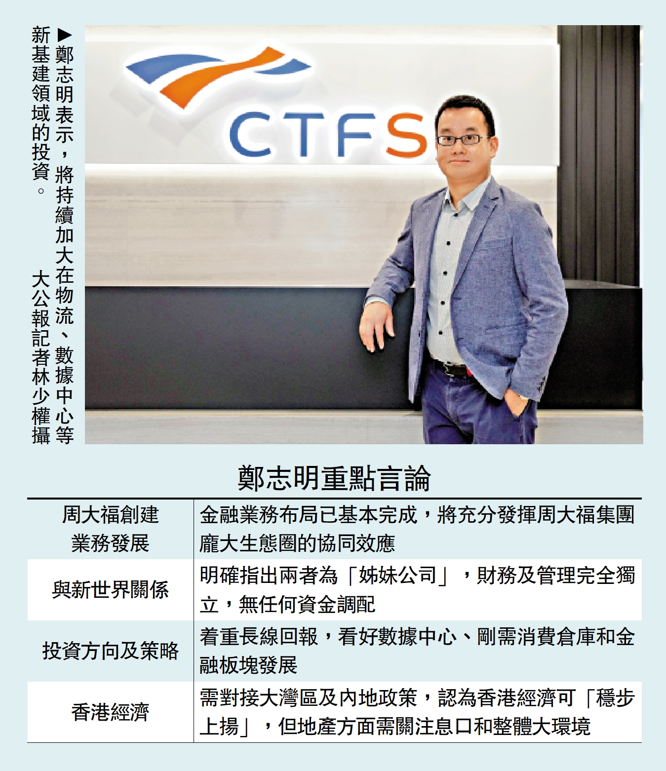 周大福創建(00659)早前收購晉羚集團及增持uSMART(盈立證券),加上周大福人壽,公司的金融業務已涵蓋財富管理、證券及保險。聯席行政總裁鄭志明接受訪問時表示,金融業務布局已基本完成,但未來仍會繼續壯大團隊人手,並尋找合適的對象進行擴展。「公司將充分發揮周大福集團龐大生態圈的協同效應,進一步拓展財富管理業務,並持續加大在物流、數據中心等新基建領域的投資。」\大公報記者 邵淑芬