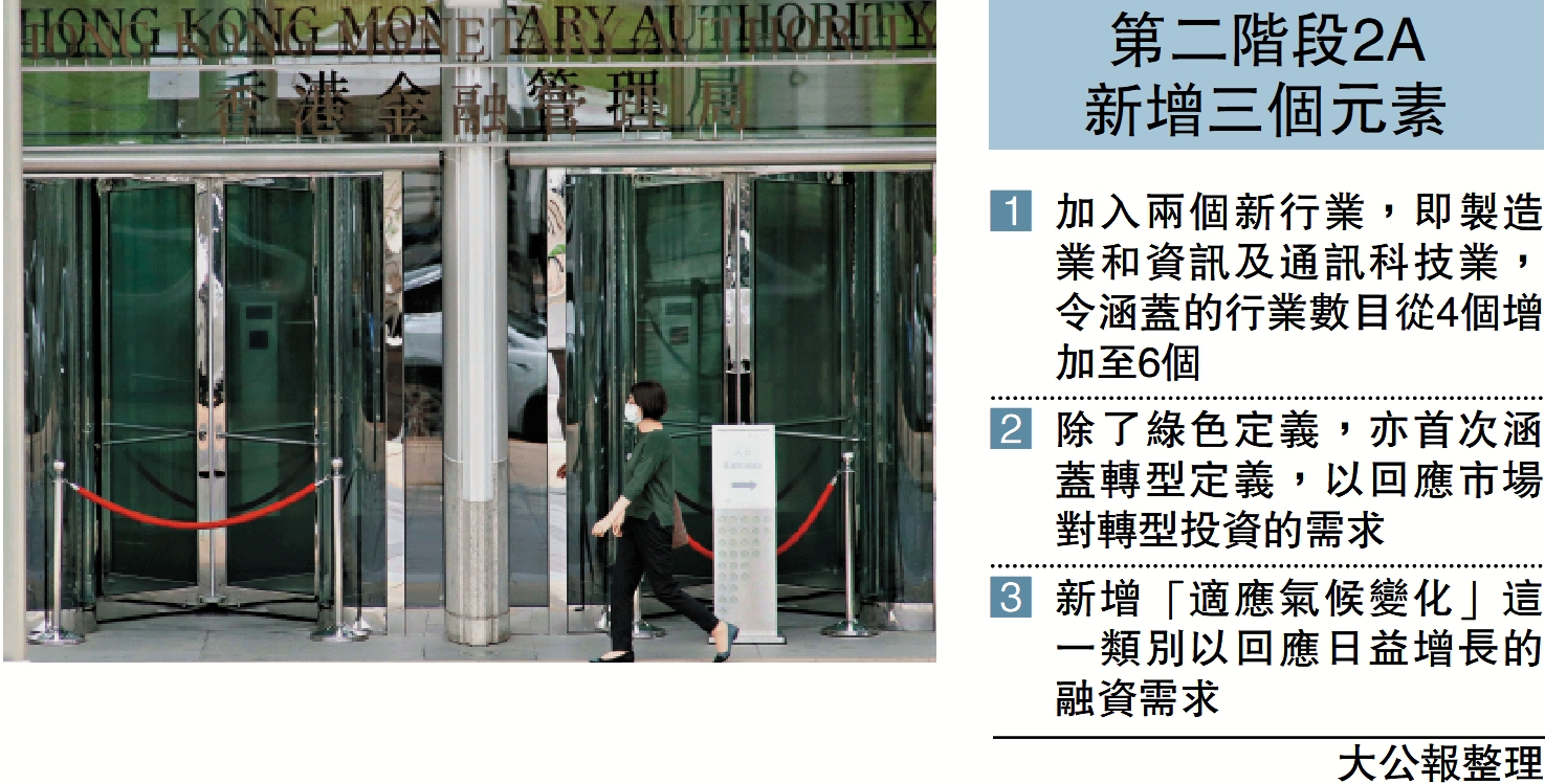 【大公報訊】金管局繼去年5月發表第一階段的《香港可持續金融分類目錄》後,將於今日(9月8日)推出第二階段2A部分的分類目錄原型,並展開一個月的公眾諮詢。金管局副總裁阮國恒於最新一期《匯思》中表示,第2A階段將新增三個元素,其中包括新增製造業和資訊及通訊科技業、首次涵蓋轉型定義,及新增「適應氣候變化」,長遠考慮將香港分類目錄納入銀行監管政策中。