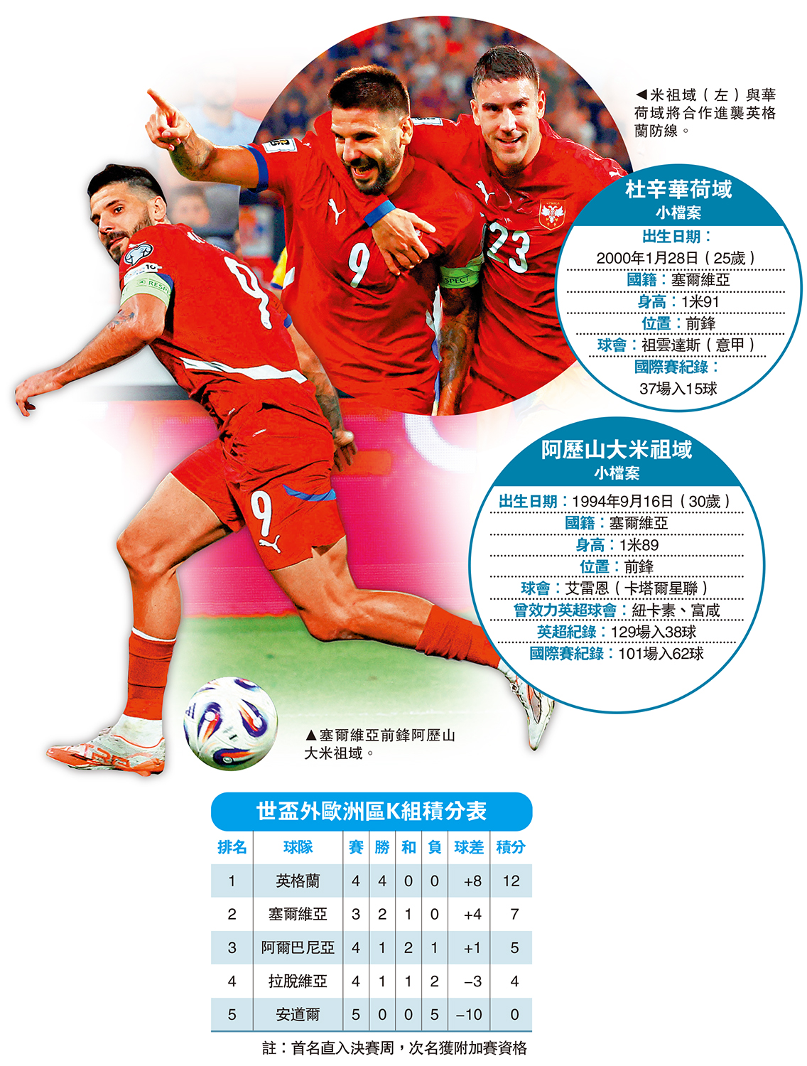 「三獅兵團」英格蘭在世界盃外圍賽小組首名最大競爭對手,非塞爾維亞莫屬,而後者的一雙箭頭也不容小覷。已累積62個國際賽入球、為塞軍歷史神射手的阿歷山大米祖域,曾經效力英超紐卡素與富咸,另一前鋒杜辛華荷域雖然未能成功於今夏登陸英超,但他已經確定今季約滿後離開祖雲達斯,亦已瞄準英超為下一個落腳地,兩位可謂英超過去與將來的「影子前鋒」,如今就要向英格蘭發炮,力圖將英軍從榜首位置中擊落。\大公報記者 譚德龍
