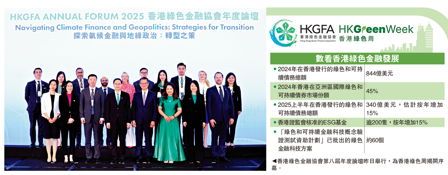 香港綠色金融協會(HKGFA)昨日在香港舉行第八屆年度論壇,為「香港綠色周」揭開序幕。財政司司長陳茂波表示,香港長久以來一直在亞洲區綠色和可持續金融市場處於領先位置。2024年在香港發行的綠色和可持續債務超過800億(美元,下同)(約6240億港元),其中綠色債券約佔該地區總額的45%。預計2025年上半年可持續債務的發行量超過340億元,按年增長15%。\大公報記者 黃裕慶、麥晉瑋
