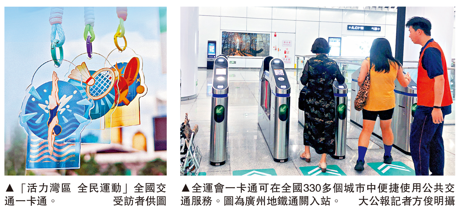 「『活力灣區 全民運動』全國交通一卡通遵循全國交通一卡通標準,可在全國330多個已開通互聯互通功能的城市中便捷使用公共交通服務。」廣州羊城通有限公司有關負責人表示,該一卡通覆蓋粵港澳大灣區核心交通場景,包括香港港鐵、港珠澳大橋穿梭巴士及澳門公交等城市公共交通系統;同時可直接用於搭乘廣東城際列車,實現一卡通行灣區、無縫銜接出行。在全運會期間,該一卡通有利於幫助緩解賽事相關人員及來穗遊客的跨區域出行壓力,提升出行便捷度。