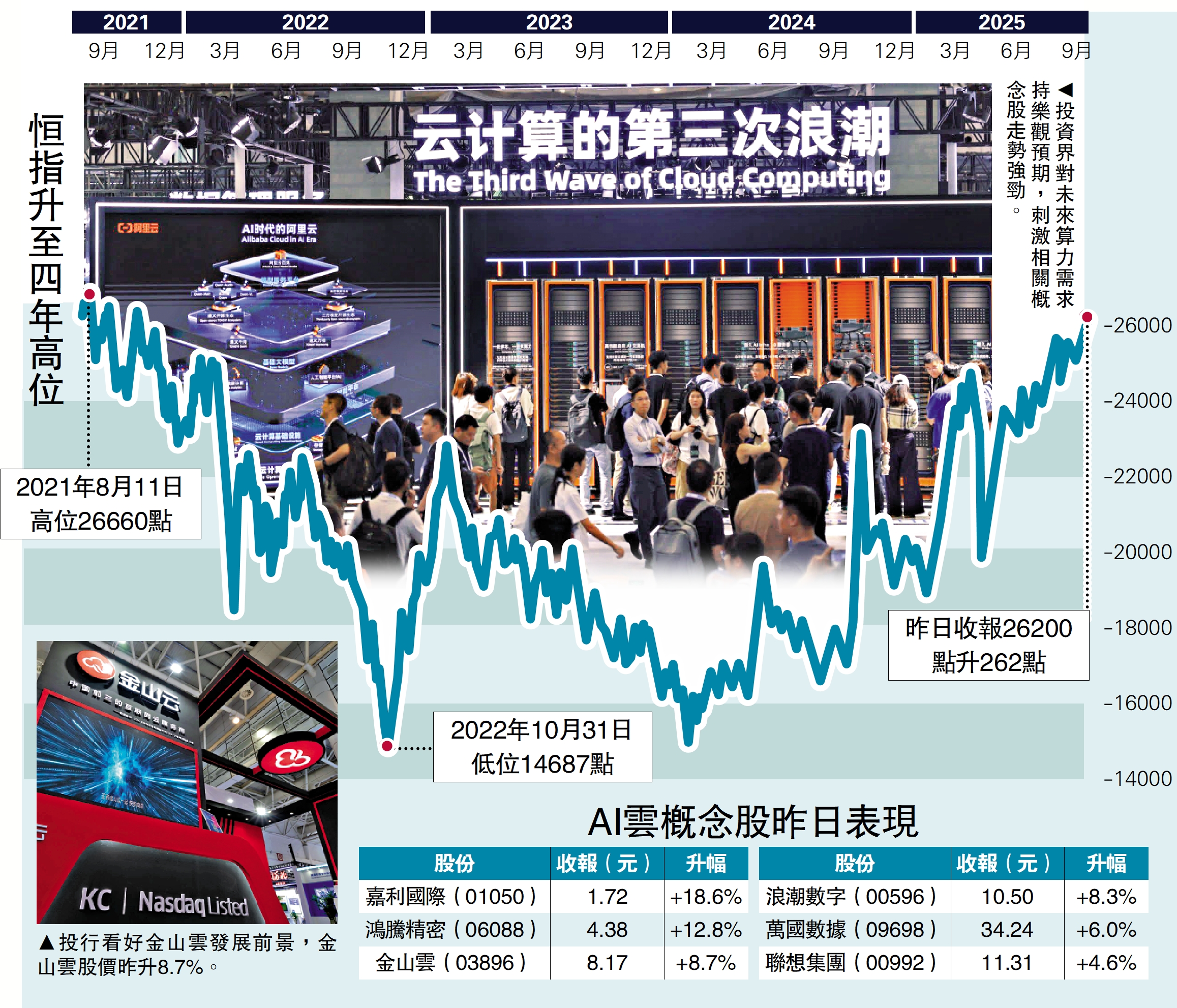 美國勞工統計局大幅向下修訂非農就業數據,市場對美國減息預期上升,港股昨日重上二萬六關,恒指收市升262點。甲骨文(ORCL.US)顯著上調雲基礎設施業務收入指引,人工智能(AI)算力股炒上,金山雲(03896)股價升8.7%;萬國數據(09698)錄得6%漲幅。