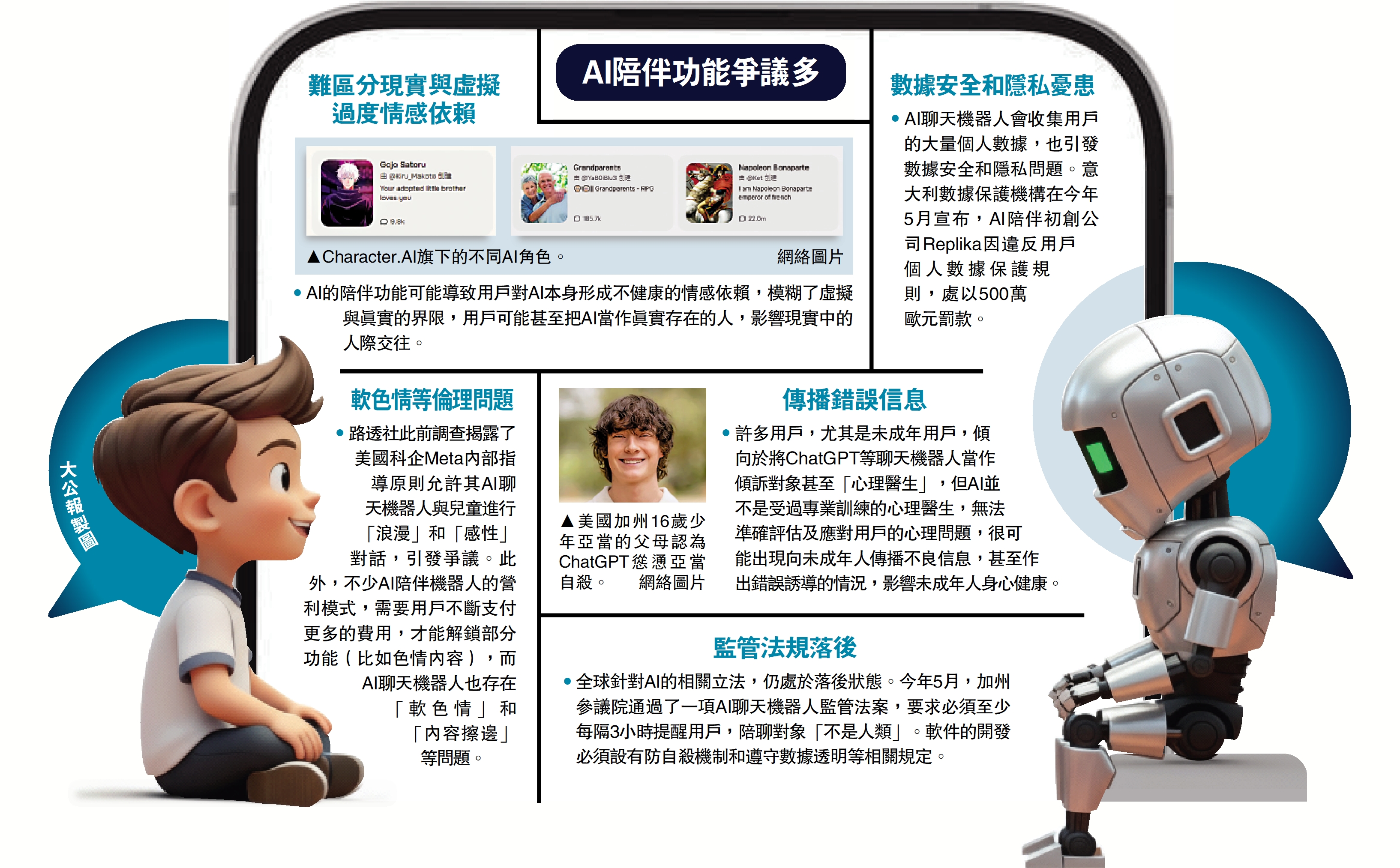•AI的陪伴功能可能導致用戶對AI本身形成不健康的情感依賴,模糊了虛擬與真實的界限,用戶可能甚至把AI當作真實存在的人,影響現實中的人際交往。