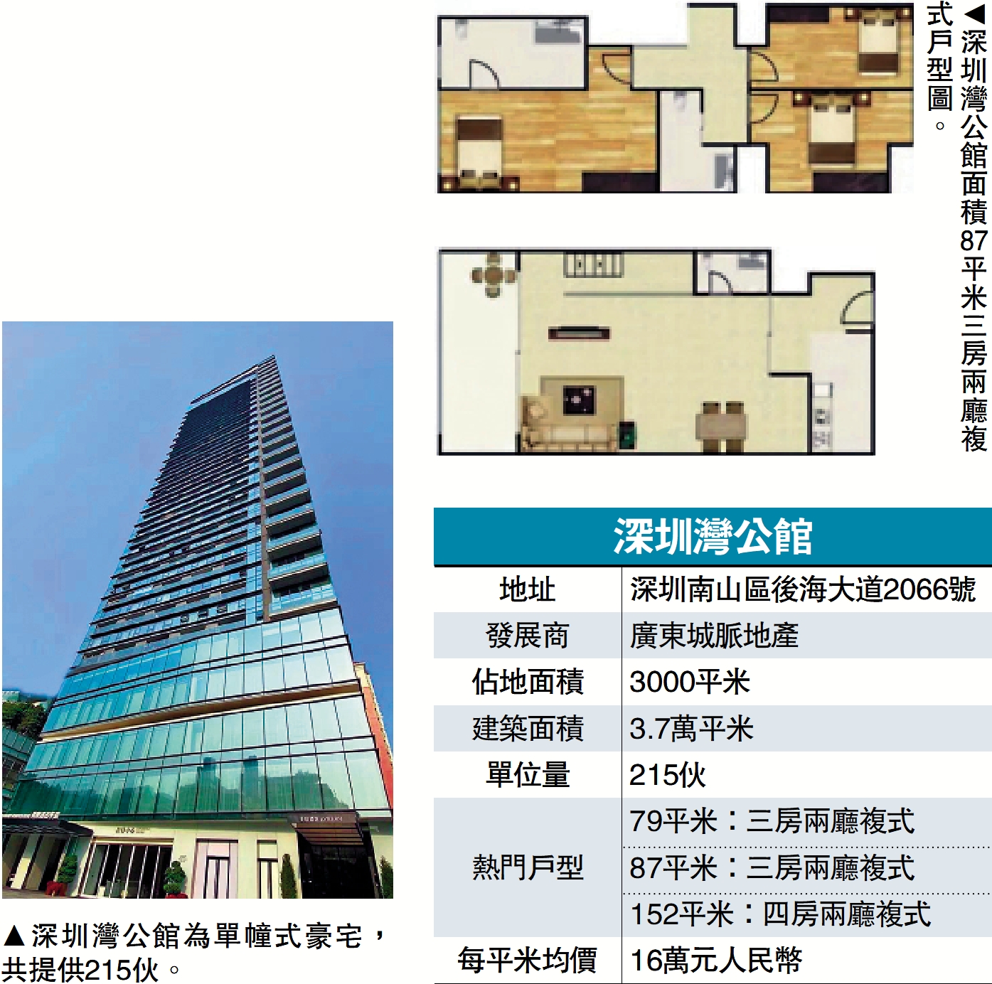 深圳灣公館於2016年竣工,總建築面積3.7萬平米,共215伙,配備200個車位,綠化率30%。屋苑位置優越,聯通福田和南山「造富」能力最強的產業片區,更通過「海、陸、空、軌」四維交通體系,構建起「15分鐘深港通勤圈」。
